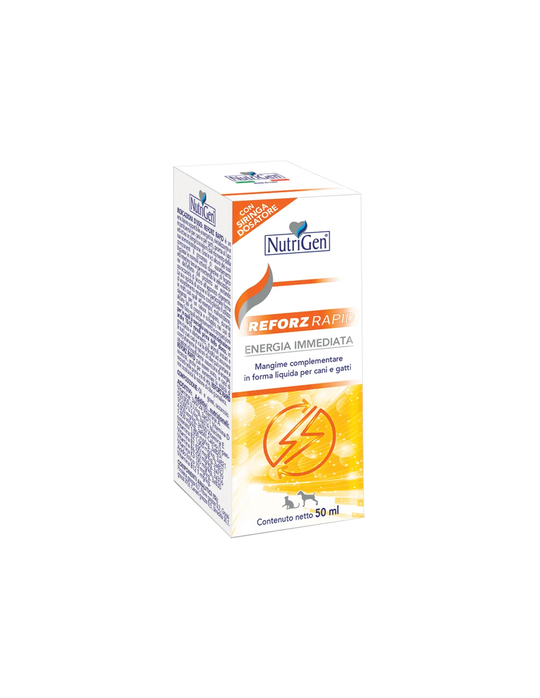 Reforz Rapid Immune Energy 50ML Nutrigen es un suplemento líquido formulado específicamente para apoyar el bienestar general y la respuesta inmune de las mascotas. Su fórmula única proporciona un rápido aporte de energía gracias a una combinación de vitaminas, aminoácidos y principios activos de alta calidad, diseñada para apoyar rápidamente al animal en caso de estados de debilidad, fatiga o durante periodos de convalecencia. Reforz Rapid Immune Energy se presenta en un cómodo formato de 50 ml, permitiendo una administración sencilla, precisa y agradable incluso para los animales más exigentes. Su uso puede ser útil en épocas de mayores necesidades energéticas y de apoyo inmunológico, como cambios estacionales, estrés ambiental, vacunaciones, viajes y postoperatorios. Su composición favorece la vitalidad y ayuda a fortalecer las defensas inmunitarias naturales del organismo. Gracias a su fórmula líquida la absorción de los nutrientes es rápida maximizando la eficacia del tratamiento. La presencia de aromas naturales hace que el sabor sea especialmente agradable, facilitando la ingesta regular del producto incluso por los más exigentes.
