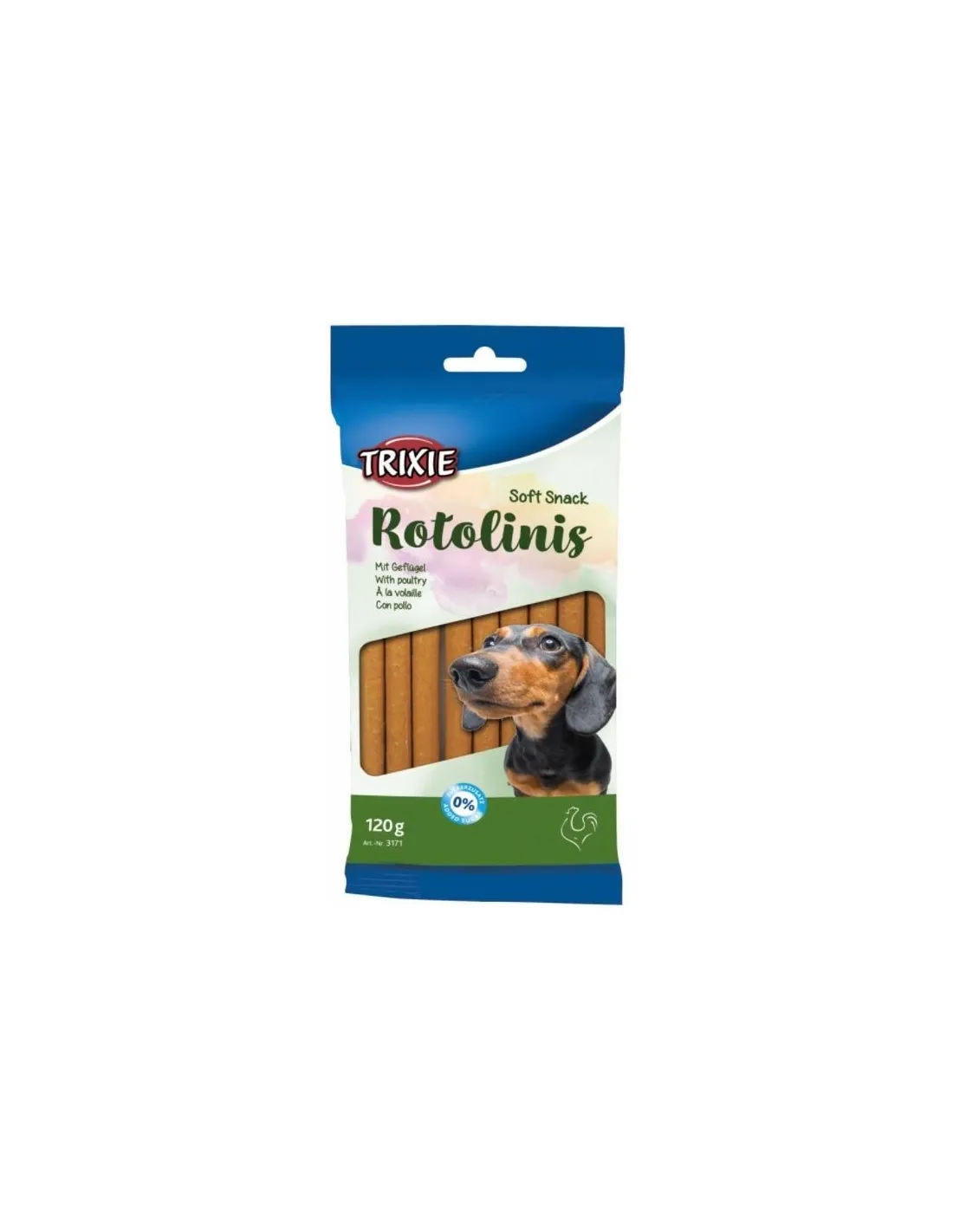 La composición de “Trixie Chicken Rotolini” ha sido cuidadosamente diseñada para ofrecer un snack de gran calidad. El ingrediente principal es el pollo, una fuente de proteína magra que aporta la energía que tu perro necesita sin apelmazarlo. La fórmula está enriquecida con ingredientes seleccionados para garantizar no sólo un excelente sabor sino también un aporte nutricional equilibrado. Los snacks están libres de colorantes y conservantes artificiales, para garantizar la máxima naturalidad y digestibilidad. No se proporciona la composición detallada, pero se puede suponer que cada ingrediente ha sido elegido para promover la salud y el bienestar del perro.