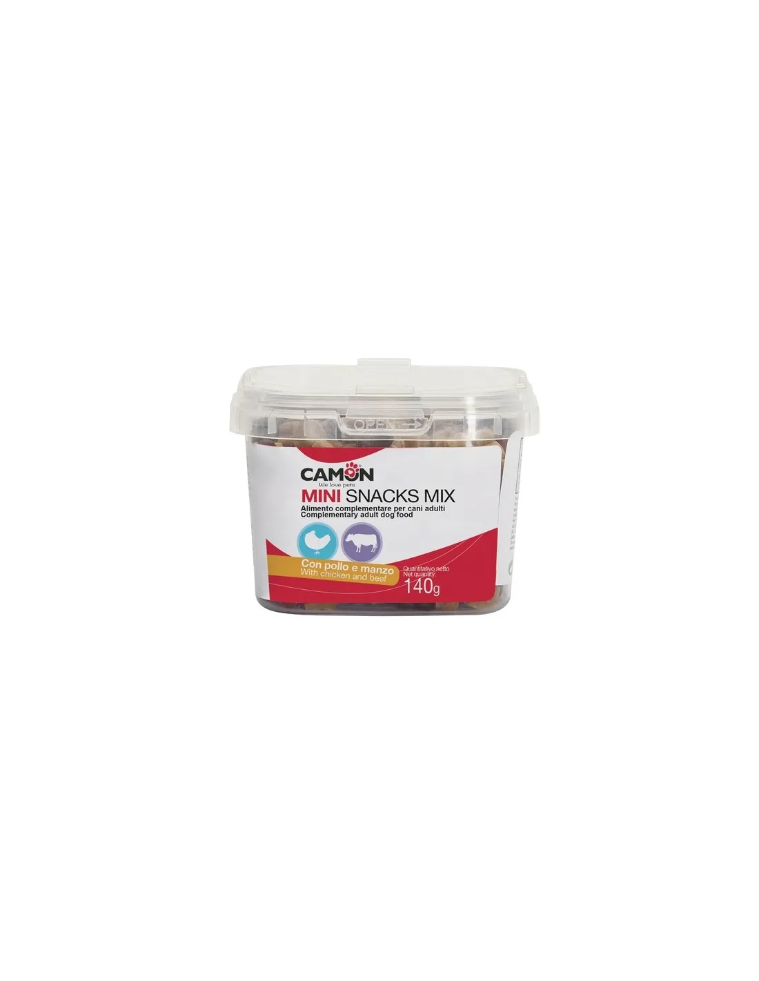CAMON MINI SNACKS MIX Los snacks Ossicini han sido creados para ser administrados fácilmente y sin complicaciones. Se pueden regalar a tu perro como premio durante las sesiones de adiestramiento, como snack entre horas o simplemente como gesto de amor. Gracias a su tamaño, son aptos para perros de todos los tamaños y pueden administrarse enteros o partidos en trozos más pequeños para perros pequeños o para una ingesta moderada.