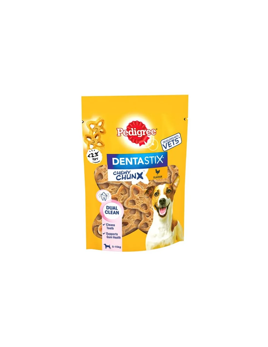 Pedigree Dentastix Chewy Chunx es un snack dental de pollo para perros de razas pequeñas. El paquete incluye 5 bolsas de 68g. Este snack pesa 68 gramos y es un delicioso snack que ayuda a limpiar los dientes del perro. Tiene un delicioso sabor a pollo y es ideal como snack o premio. Es apto para perros que pesen entre 5 y 15 kg. Los ingredientes activos de estas golosinas crujientes ayudan a mantener limpios los dientes de su perro. Para perros grandes, está disponible la variante maxi Chewy Chunx.