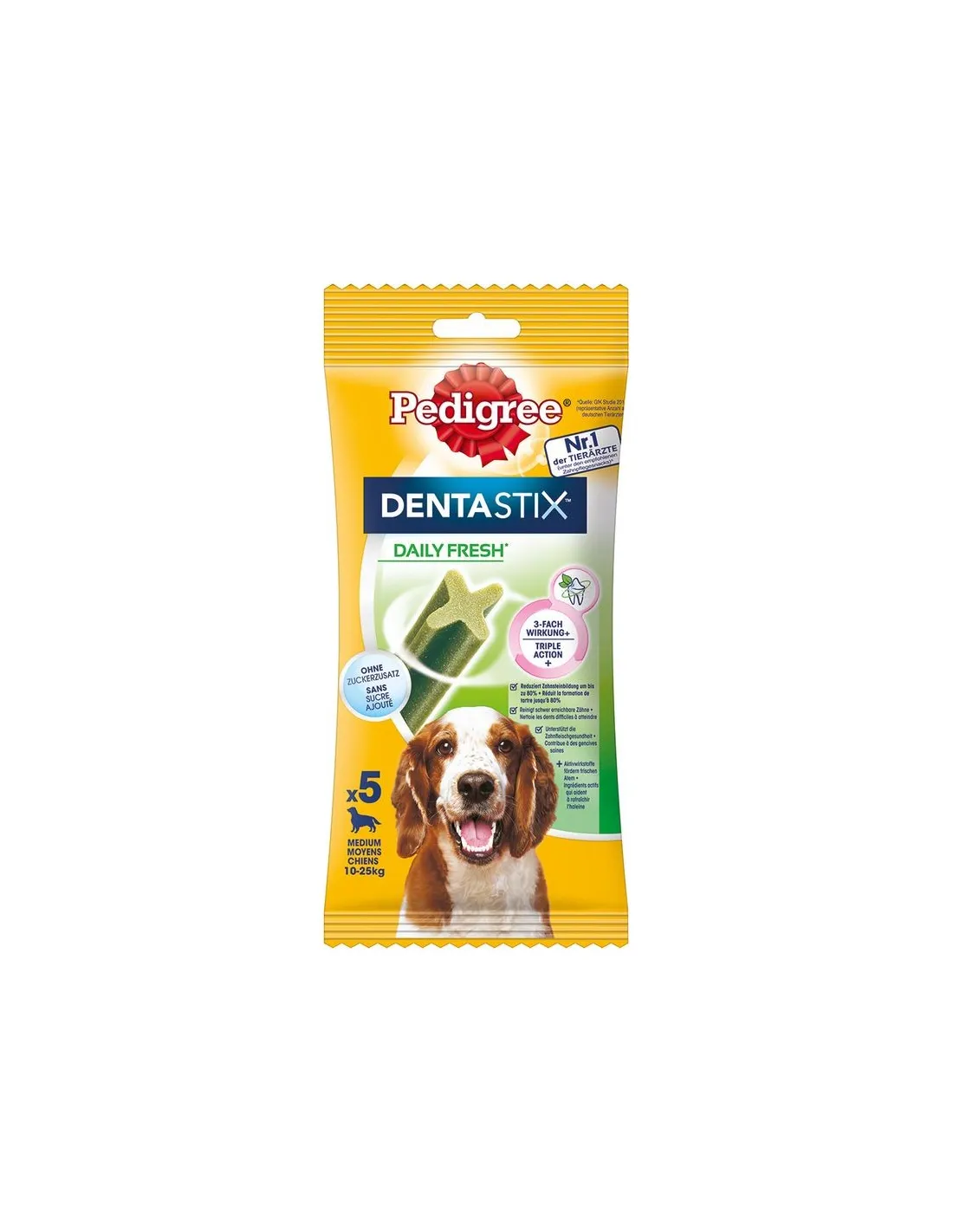 Pedigree Dentastix Fresh Snack para la higiene bucal para Perros Medianos 5 Piezas 128 g es un snack para perros de tamaño mediano, diseñado para la higiene bucal del animal. El paquete contiene 5 piezas con un peso total de 128 gramos. Este producto, si se mastica diariamente, gracias a su especial consistencia, está científicamente demostrado que ayuda a reducir la formación de sarro hasta en un 80%, limpia los dientes de más difícil acceso y ayuda a mantener las encías sanas.