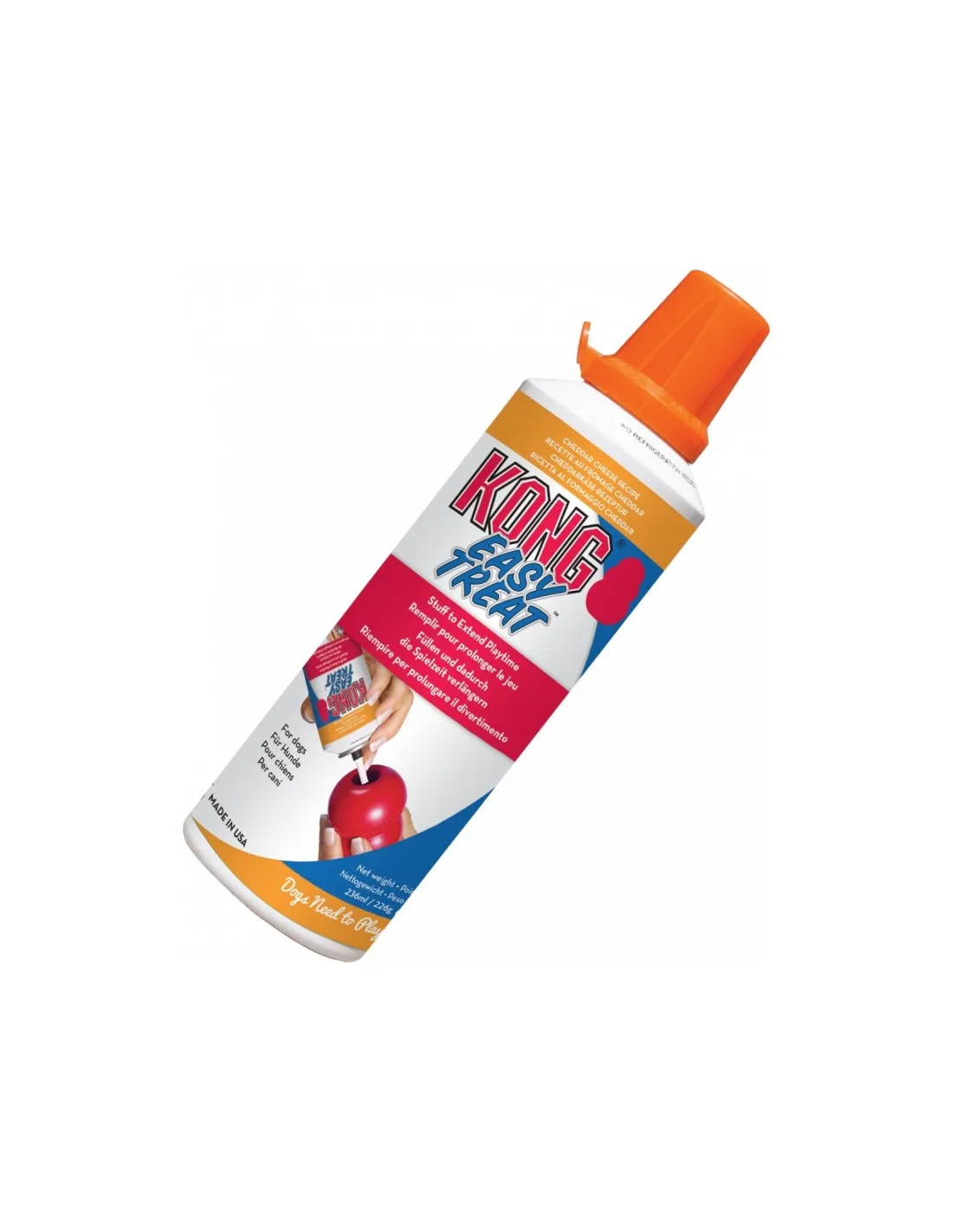 La pasta para perros KONG Easy Treat Cheddar Cheese se puede aplicar fácilmente a cualquier juguete de goma KONG gracias a su exclusivo pulverizador. El juguete KONG relleno de KONG Cheddar Cheese se puede congelar para prolongar la diversión y estimulación mental del perro.
