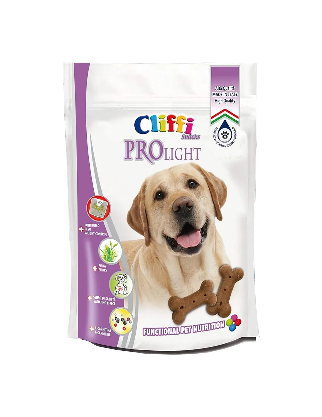 CARACTERÍSTICAS: CLIFFI PRO-LIGHT es un snack sabroso y suave que ayuda a combatir los problemas de sobrepeso que padece el 40% de los perros. El exceso de peso repercute negativamente en la salud y disminuye la esperanza de vida ya que representa un importante factor de riesgo para la aparición de numerosas patologías. CLIFFI PRO-LIGHT es rico en fibra y bajo en grasas, contiene L-carnitina, que ayuda a quemar grasas regulando su metabolismo. Es un delicioso snack entre horas que da sensación de saciedad sin agobiar, un excelente premio para premiarlo sin remordimientos, una válida ayuda para mantener un peso saludable, sin rendirse.