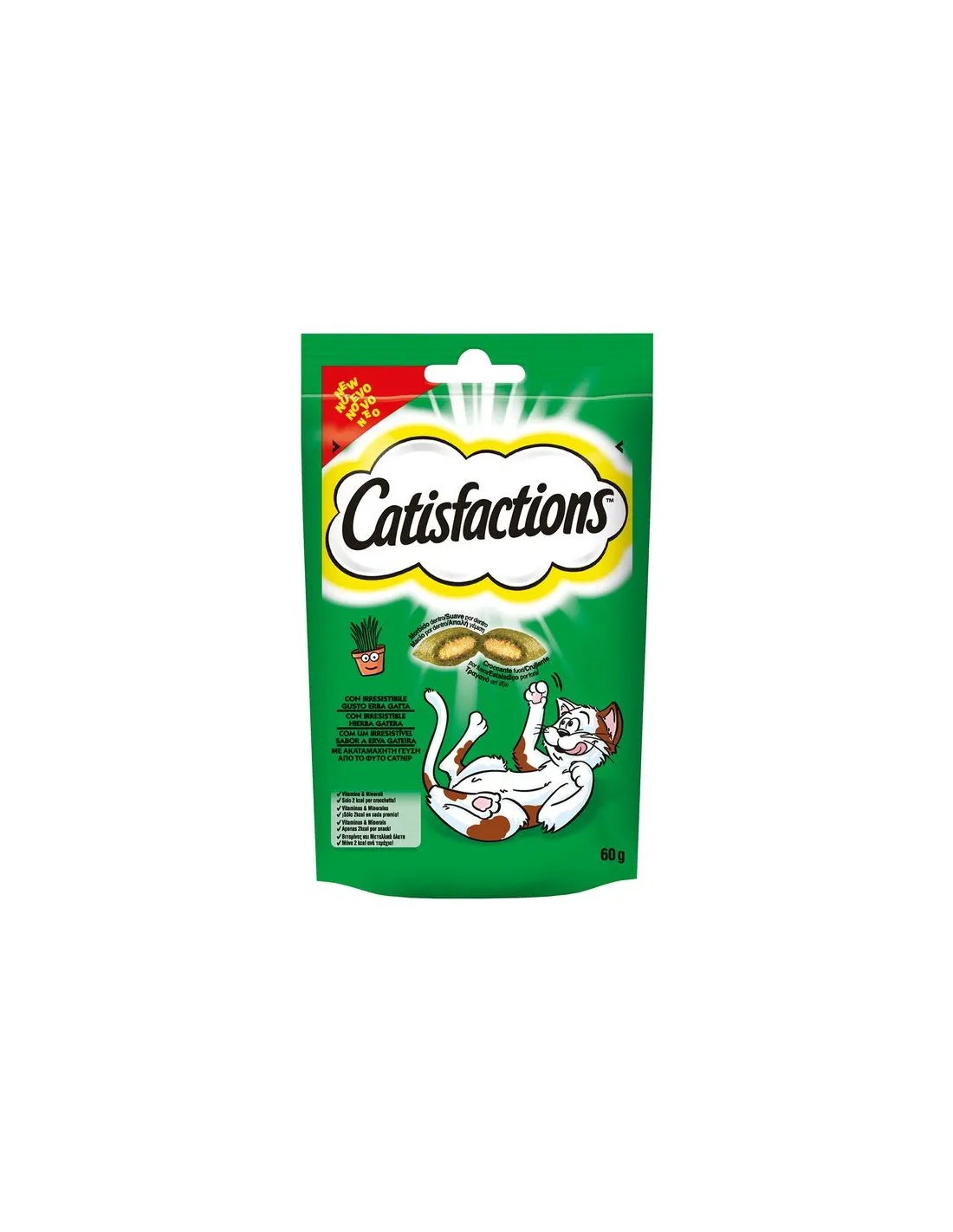 Catisfactions es un snack irresistible para gatos, enriquecido con hierba gatera. Este snack está disponible en packs de 60g, ideal para premiar a tu gato en cualquier momento del día.