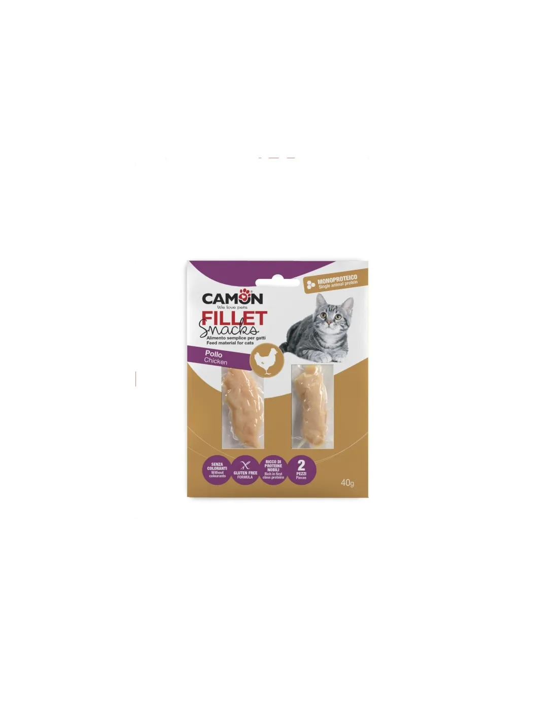 El producto “Camon gato - Línea Filete Snack - filetes de pollo 40 gr. - AF210” es un snack de alta calidad para gatos, perteneciente a la línea Filete Snack de la marca Camon. Se trata de unos deliciosos filetes de pollo, elaborados cuidadosamente para satisfacer el paladar de los gatos más exigentes. Cada filete está elaborado con pollo monoproteico, garantizando un aporte de proteínas nobles esenciales para la salud y el bienestar del gato. La fórmula sin colorantes ni gluten hace que estos filetes sean una excelente opción para gatos con sensibilidades o alergias alimentarias.