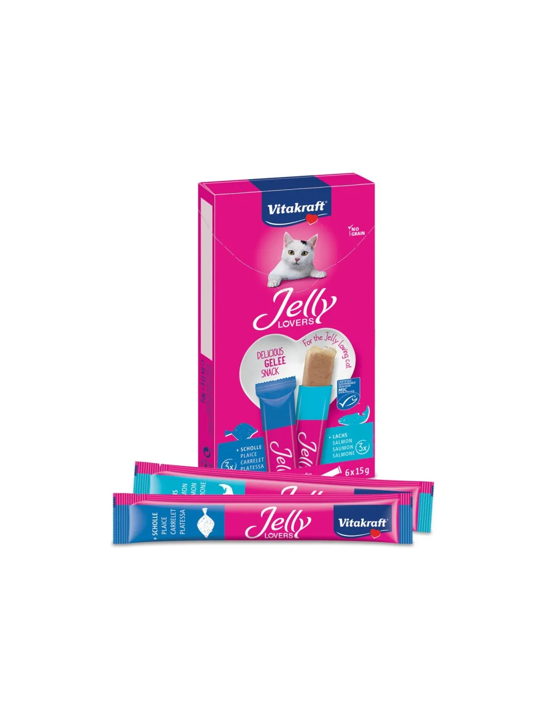 Jelly Lovers son snacks premium para gatos que combinan el placer de la gelatina con ingredientes de alta calidad como pollo, pavo, solla y salmón MSC. Estos snacks no sólo deleitan el paladar de los gatos, sino que también están formulados para ser bajos en calorías, lo que los convierte en una excelente opción para los dueños de mascotas preocupados por su salud.