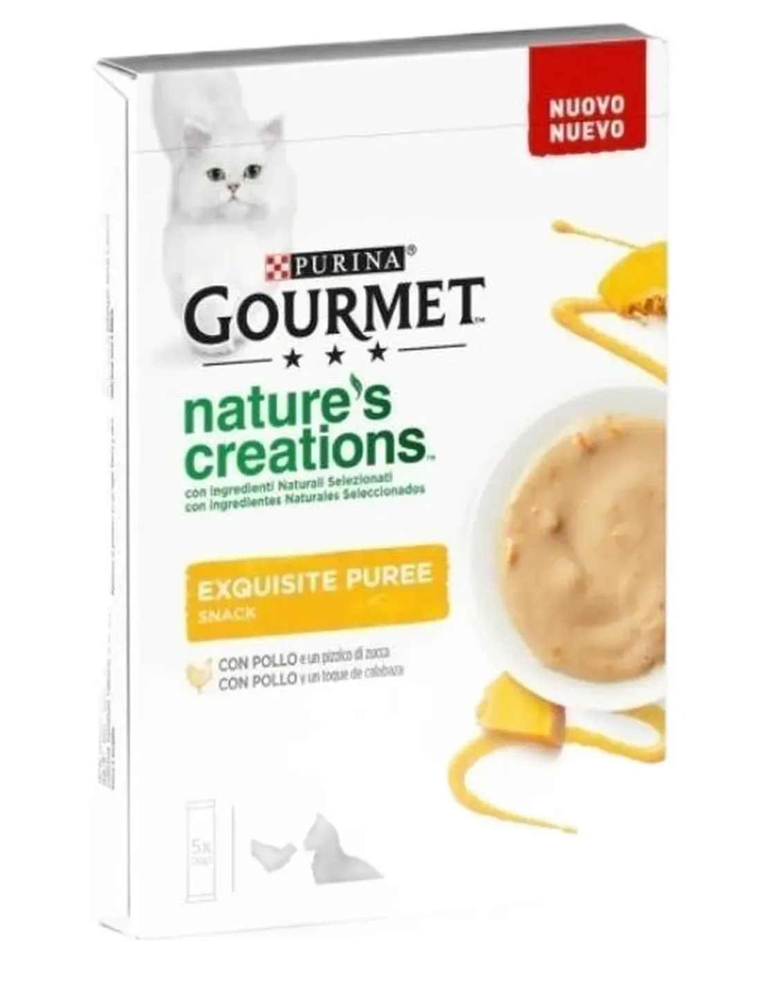 Descubre el Puré Exquisito Gourmet Nature's Creations con ingredientes naturales seleccionados de calidad para un delicioso snack entre horas. Una refinada receta preparada con pollo y una pizca de calabaza para deleitar a tu gato con un snack exquisito y delicado. Cada puré está convenientemente porcionado y listo para servir en su propio bol o directamente del sobre, para compartir momentos de placer con tu gato.