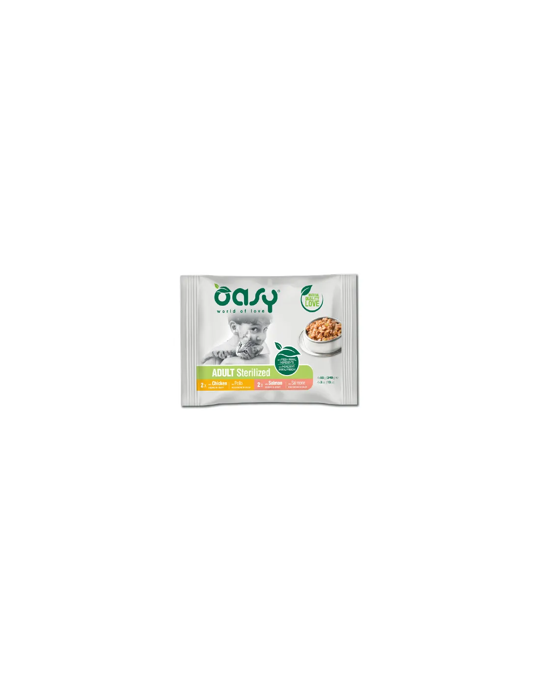 Oasy Wet Cat Bites en Salsa es un alimento completo y equilibrado, específicamente formulado para cubrir las necesidades nutricionales de los gatos esterilizados. Este multipack contiene cuatro bolsitas de 85 gramos cada una, con dos sabores diferentes: pollo y salmón, asegurando variedad y placer al paladar de tu gato.