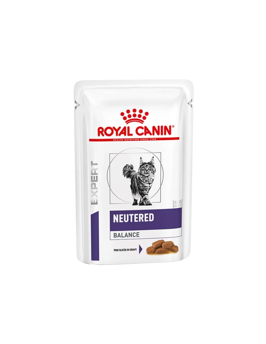 Royal Canin Veterinary Neutered Adult Maintenance es un alimento completo y equilibrado en sobres, formulado específicamente para gatos adultos castrados. Cada pack contiene 12 sobres de 85g cada uno, ideales para mantener el peso ideal y favorecer la salud urinaria de tu gato.