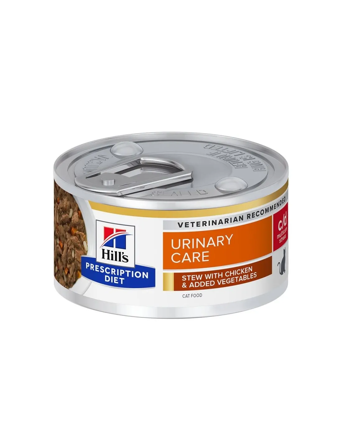 Hill's - Prescription Diet Feline - c/d Urinary Stress Stew - 82gr es un alimento dietético húmedo para gatos adultos, formulado para apoyar la salud urinaria del gato y al mismo tiempo controlar el estrés. Está clínicamente probado que este producto reduce la tasa de recurrencia de los signos urinarios más comunes en un 89%. Está disponible en sabores de pollo y atún.
