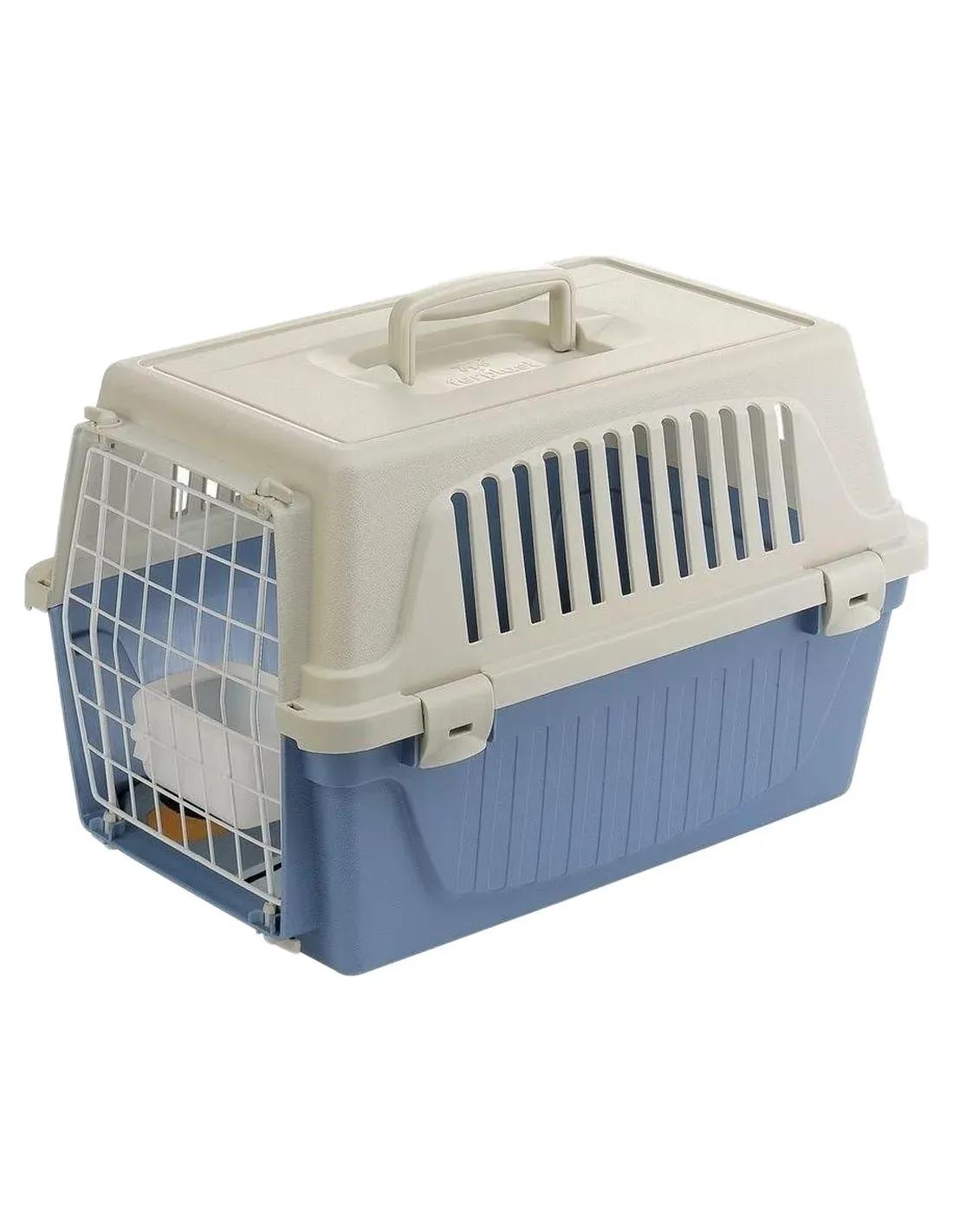 Ce panier de transport en plastique pour chats et petits chiens est doté d'une solide porte en acier plastifié, très robuste grâce au système de fixation par mousquetons latéraux ; Les grilles d'aération latérales garantissent également une ventilation interne suffisante.
