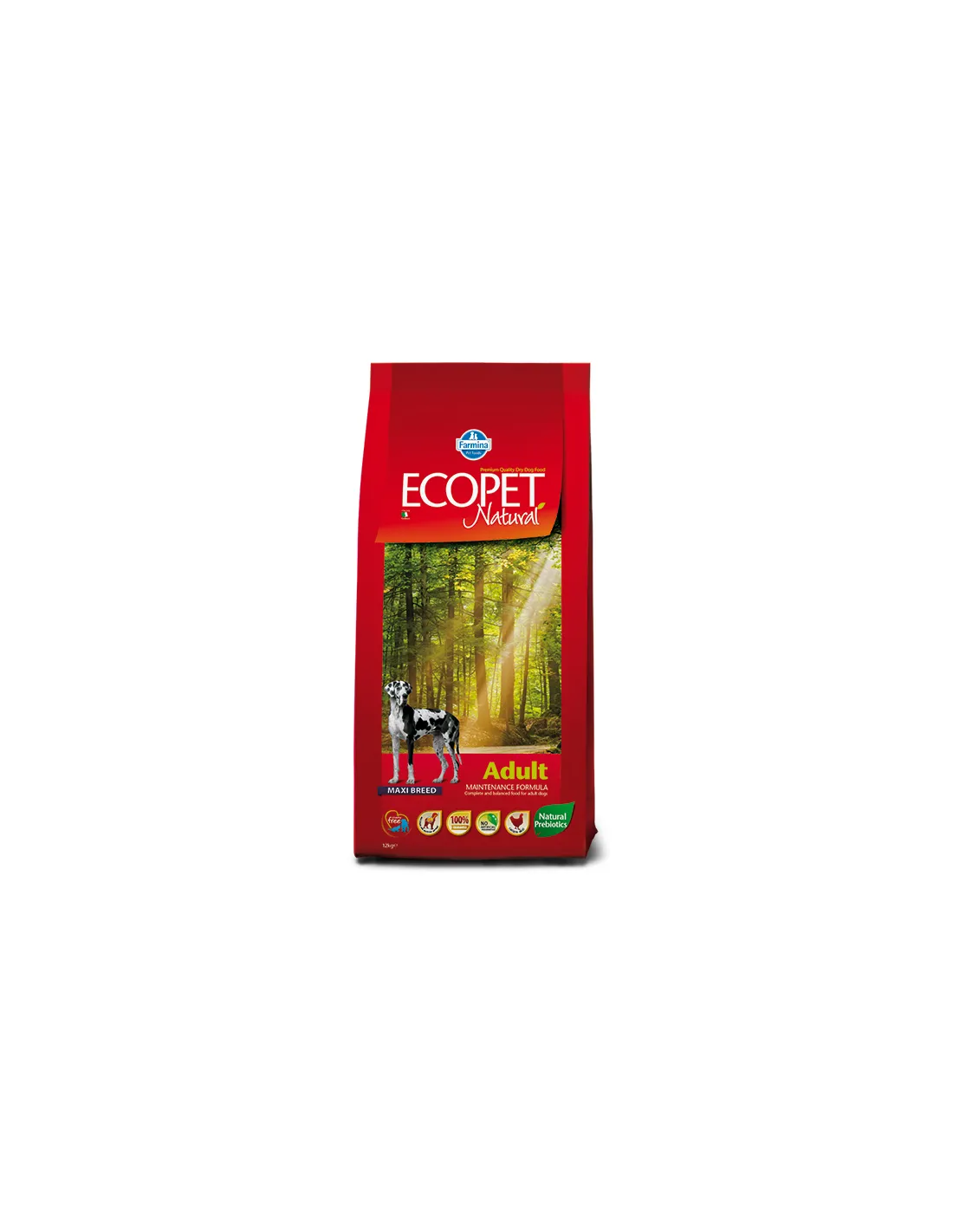 La gamme Ecopet Natural de Farmina Pet Foods a été développée dans le but d'offrir un produit naturel et complet, qui respecte les besoins nutritionnels des chiens de grande race. La composition de l'aliment comprend du maïs et 22% de protéines de poulet déshydratées, des éléments qui fournissent l'énergie et les acides aminés essentiels nécessaires au soutien de la masse musculaire. La farine de blé, la graisse de poulet et la pulpe de betterave contribuent à une alimentation équilibrée, tandis que le riz est une source de glucides facilement assimilables.