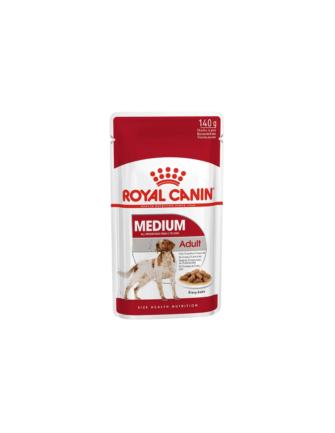 Royal Canin Medium Adult est une nourriture humide pour chiens de taille moyenne, conditionnée en barquettes pratiques de 140 grammes, disponible en paquets de 10 pièces.