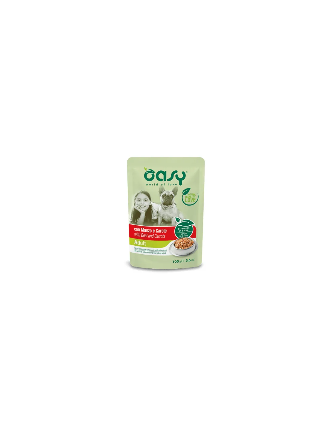 Oasy Dog Adult Bœuf et Carottes est un aliment humide complet et équilibré pour chiens adultes de toutes tailles. Ce produit est idéal pour offrir à votre compagnon à quatre pattes un repas savoureux et nutritif, grâce à sa recette à base d'ingrédients de haute qualité. Le sachet de 100 grammes contient des lanières en sauce, préparées avec 42% d'ingrédients d'origine animale, dont 4% de bœuf, et enrichies de carottes déshydratées, ce qui équivaut à 4,4% de carottes fraîches. La composition de cet aliment a été conçue pour apporter tous les nutriments nécessaires au maintien de la santé et du bien-être du chien, avec une attention particulière à l'appétence.