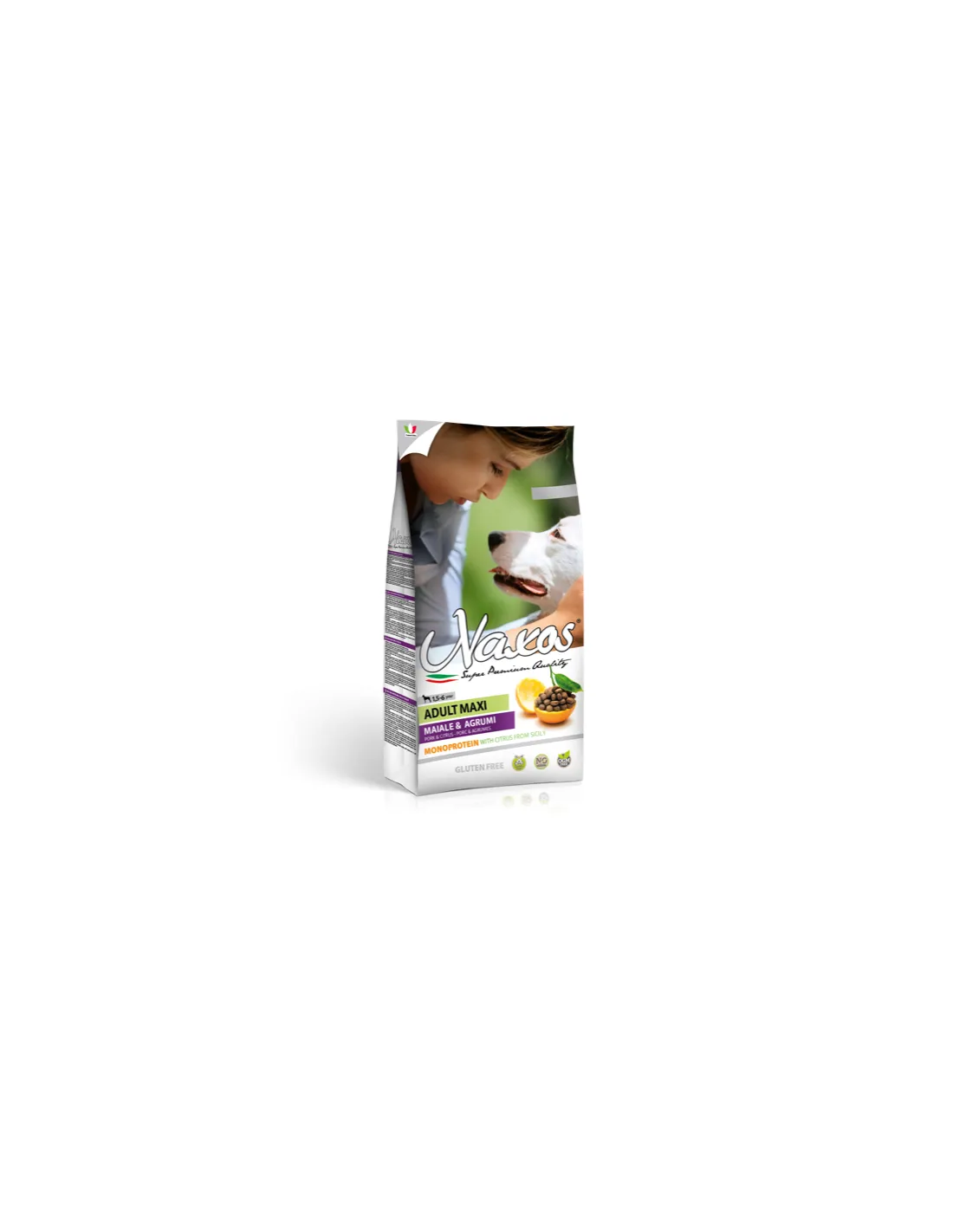Le produit "Adult Maxi Pork and citrus" est un aliment pour chiens adultes de taille maxi, produit par Adragna Pet Food. L'ingrédient principal est le porc, une source de protéines à haute valeur biologique, hautement digestible et savoureuse. Le produit est disponible en format 3kg ou 12kg.