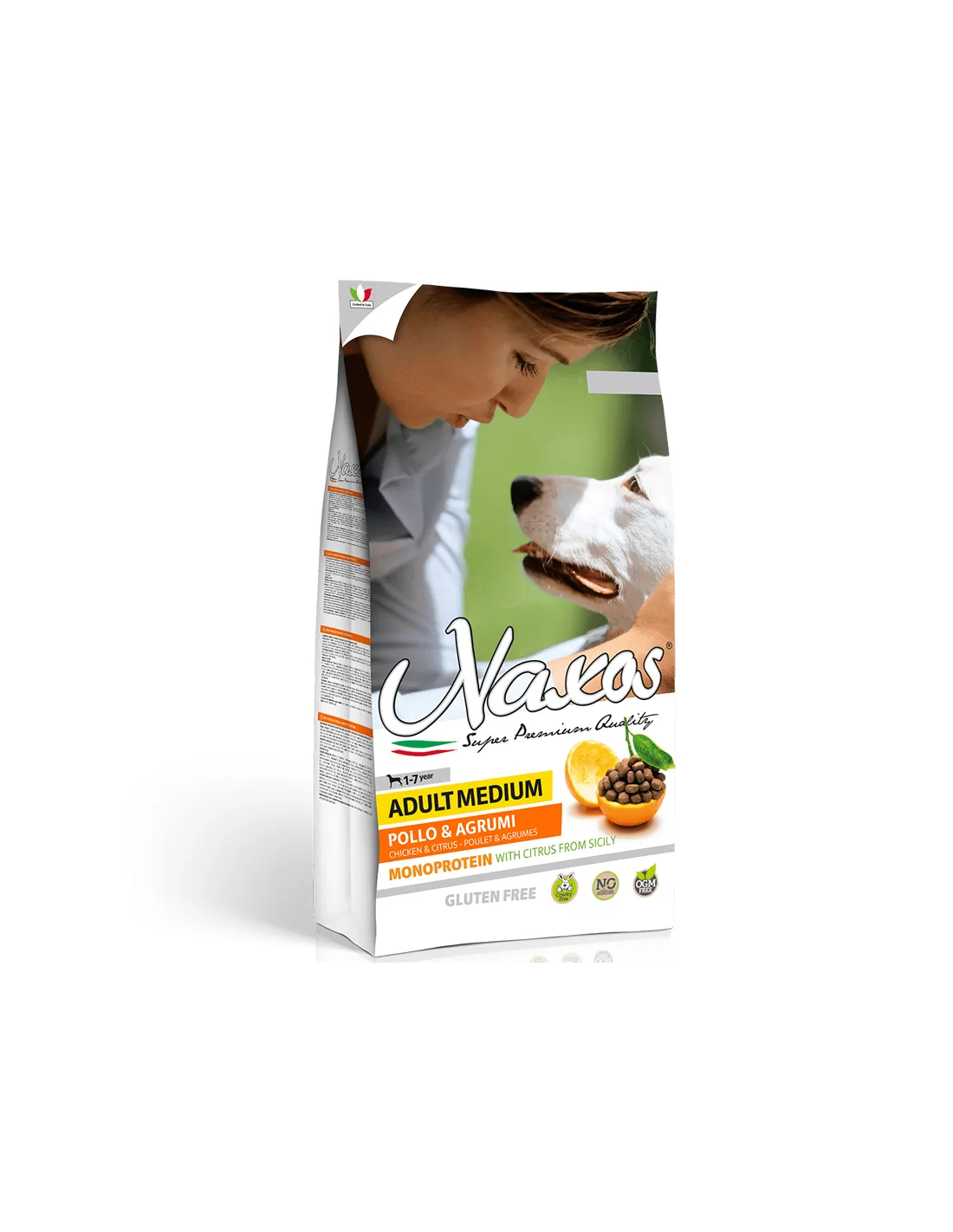 Naxos Dog Adult SteriLight Medium Maxi Poulet et Agrumes convient aux chiens adultes de taille moyenne et grande. Grâce à sa formule monoprotéinée et sans gluten, il convient également aux chiens souffrant d'intolérances ou d'allergies alimentaires.