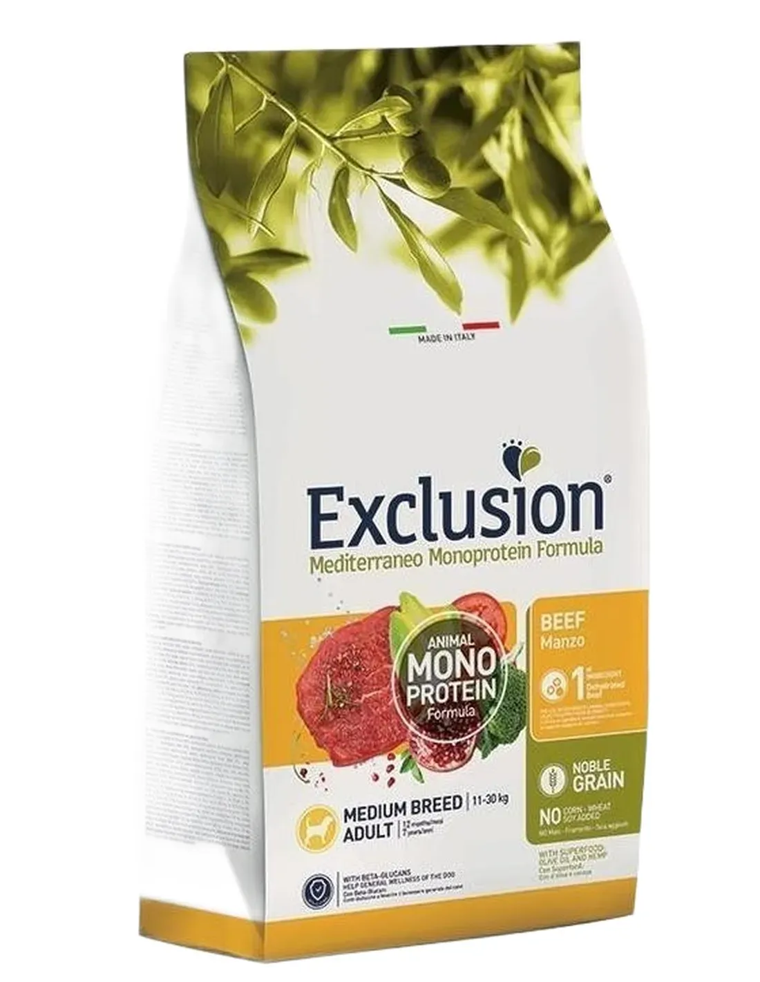 Exclusion Mediterraneo Monoprotein Formula – Noble Grain est un aliment complet et équilibré formulé avec une seule source de protéines animales déshydratées, pour une recette claire et essentielle, et uniquement une céréale noble de haute qualité. Il est conservé avec des antioxydants naturels et intégré aux bêta-glucanes. Il est élaboré avec une recette innovante de Superaliments issus de la tradition méditerranéenne : Chanvre, Huile d'Olive, Tomate, Grenade, Brocoli et Chicorée. Sans graisse de poulet, blé, soja et maïs ajoutés.