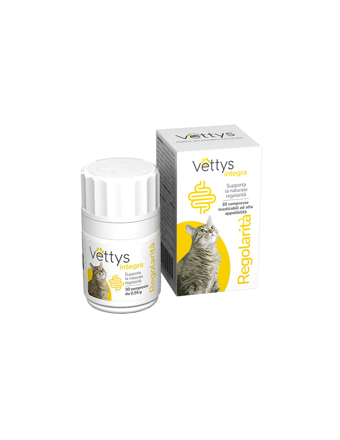 Vettys Integra Regularity Cat est un aliment complémentaire en comprimés à croquer créé pour favoriser le bien-être intestinal et le bon fonctionnement de la flore entérique du chat. Ce complément a été conçu pour contribuer à améliorer la qualité des selles et à maintenir la beauté du pelage et la santé de la peau du chat. Sa formule contient des ingrédients actifs qui remplissent des fonctions prébiotiques, probiotiques et postbiotiques, essentielles à un système digestif sain. Les comprimés sont très appétissants et peuvent être administrés directement ou mélangés à la ration alimentaire quotidienne pendant des périodes de 15 à 30 jours, selon les besoins du chat. Il est important de veiller à ce que l'animal ait toujours accès à de l'eau fraîche pendant la période d'alimentation. Gardez le produit hors de portée des enfants et rangez-le dans un endroit frais et sec, à l'écart des sources de chaleur et de la lumière directe du soleil.