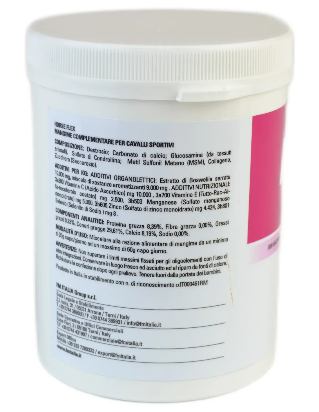 La poudre Horse Flex FM Italia est composée d'un mélange équilibré d'éléments actifs naturels et complémentaires, conçu pour garantir efficacité et sécurité dans le traitement des articulations des chevaux. Les ingrédients actifs comprennent le sulfate de glucosamine, le sulfate de chondroïtine, le méthylsulfonylméthane (MSM), l'acide hyaluronique et une sélection de vitamines et de minéraux essentiels tels que le zinc et le manganèse.