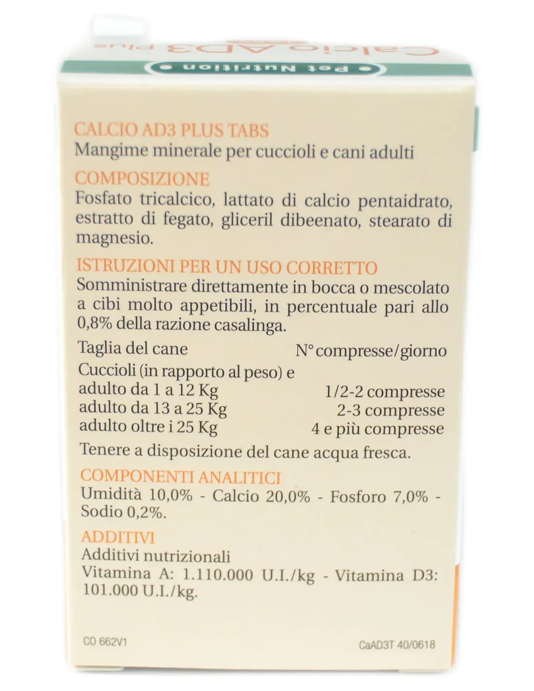 Calcio Ad3 Soluble Sviluppo Tabs est un complément alimentaire spécialement développé pour favoriser la croissance correcte et le développement harmonieux des chiots chiens, en fournissant un apport équilibré en calcium et en vitamines essentielles telles que la vitamine A et la vitamine D3.