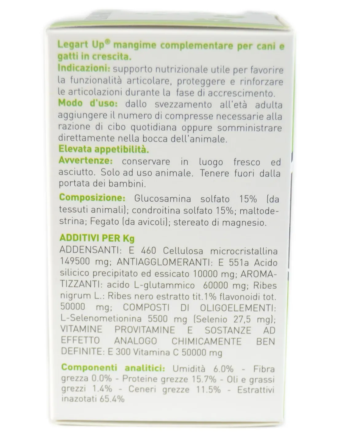 C'est un support nutritionnel utile pour favoriser la fonctionnalité et le développement du système squelettique pendant la phase de croissance des chiens et des chats, également utile, à des fins préventives, chez les adultes à risque chez lesquels les signes cliniques d'arthrose ne sont pas encore apparus. Legart Up est un complément alimentaire en comprimés à croquer pour chiots et chatons, à base de Glucosamine, Chondroïtine sulfate et Vitamines, il est recommandé pour renforcer le cartilage articulaire des chiens et des chats pendant la phase de croissance, étant un adjuvant pour les articulations il favorise un développement articulaire harmonieux, prévient l'apparition de pathologies et assure un développement osseux naturel et contrôlé.