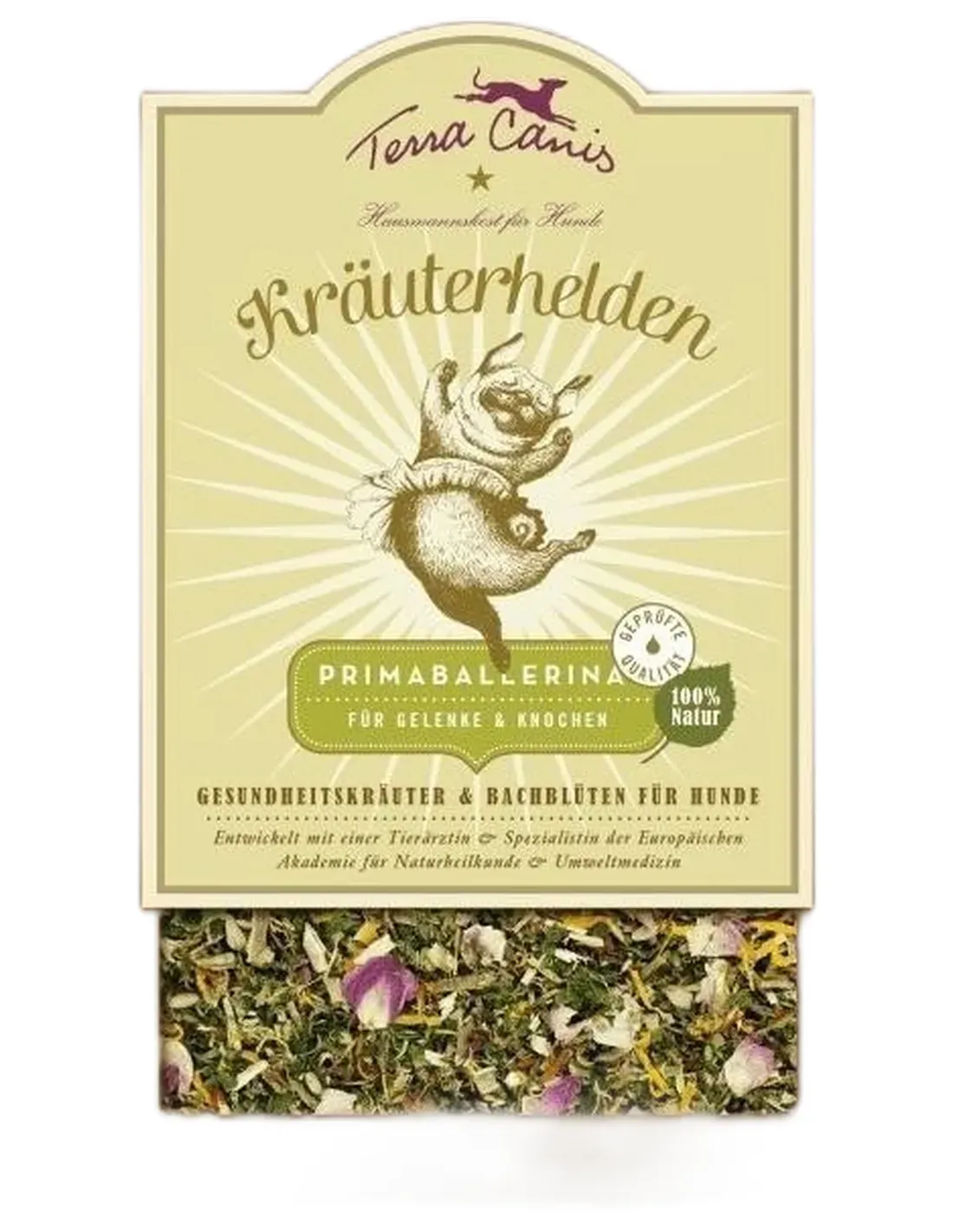 Les maladies articulaires douloureuses ne sont pas rares chez nos amis à quatre pattes. Des malformations génétiques, un accouplement incorrect, une mauvaise alimentation, un surpoids ou un stress excessif et constant sur les articulations peuvent provoquer divers troubles du système musculo-squelettique. Un cas classique des causes évoquées ci-dessus est l’arthrose, qui est dégénérative et incurable. Les symptômes comprennent une faiblesse, une raideur et une douleur permanente. Les herbes médicinales et fleurs de Bach de Terra canis herbes articulations 100 g, l'un des HERBAL HEROES de Terra Canis, sont connues pour leur action positive sur le métabolisme articulaire et la production de liquide synovial. En naturopathie, la griffe du diable est utilisée contre les troubles articulaires. Les fleurs de Bach Centaurée, Gentiane et Rose Sauvage apportent un soutien supplémentaire.