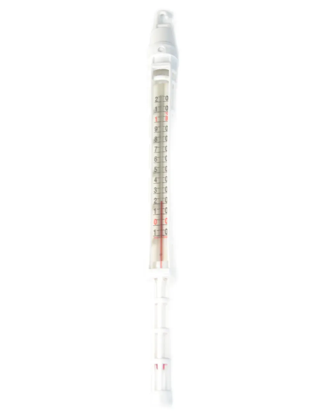 La présence du crochet permet une fixation stable et sûre à l'intérieur des cages à lait, facilitant le positionnement du thermomètre pour qu'il reste immergé dans le liquide, garantissant des mesures précises et constantes sans avoir à le tenir manuellement pendant l'utilisation.