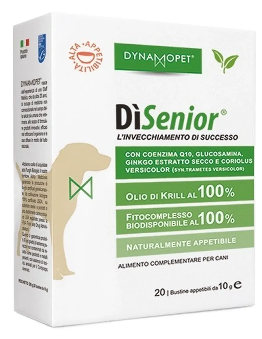 DìSenior est un aliment complémentaire développé pour favoriser un vieillissement réussi chez le chien. Ses composants peuvent contribuer à fournir des éléments utiles pour réduire le stress oxydatif et les processus inflammatoires chroniques typiques des animaux âgés ; la présence d'extraits botaniques soutient les fonctions cognitives normales et le bien-être physiologique des articulations. Ses phytocomplexes, combinés à la présence dans la formule d'Oméga 3 issus d'huile de Krill extrêmement pure et d'excellente assimilabilité, en font un produit unique et indispensable au bien-être de l'animal.