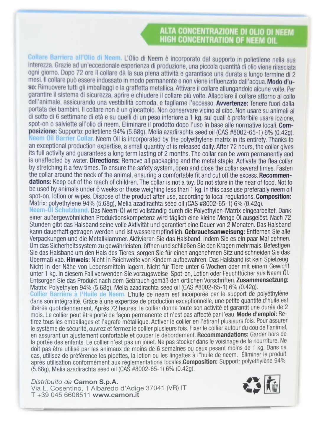 Le collier Protection Leis Barriera Camon est indiqué pour la protection du chien contre les infestations de parasites externes tels que les puces (Ctenocephalides spp.), les tiques (dont Rhipicephalus sanguineus, Ixodes ricinus et Dermacentor spp.) et les moustiques, qui peuvent être vecteurs de maladies même graves. La protection apportée par le collier s'étend sur plusieurs semaines, offrant une solution continue contre l'apparition de parasites, évitant ainsi les démangeaisons, les irritations cutanées et la transmission éventuelle de pathologies.