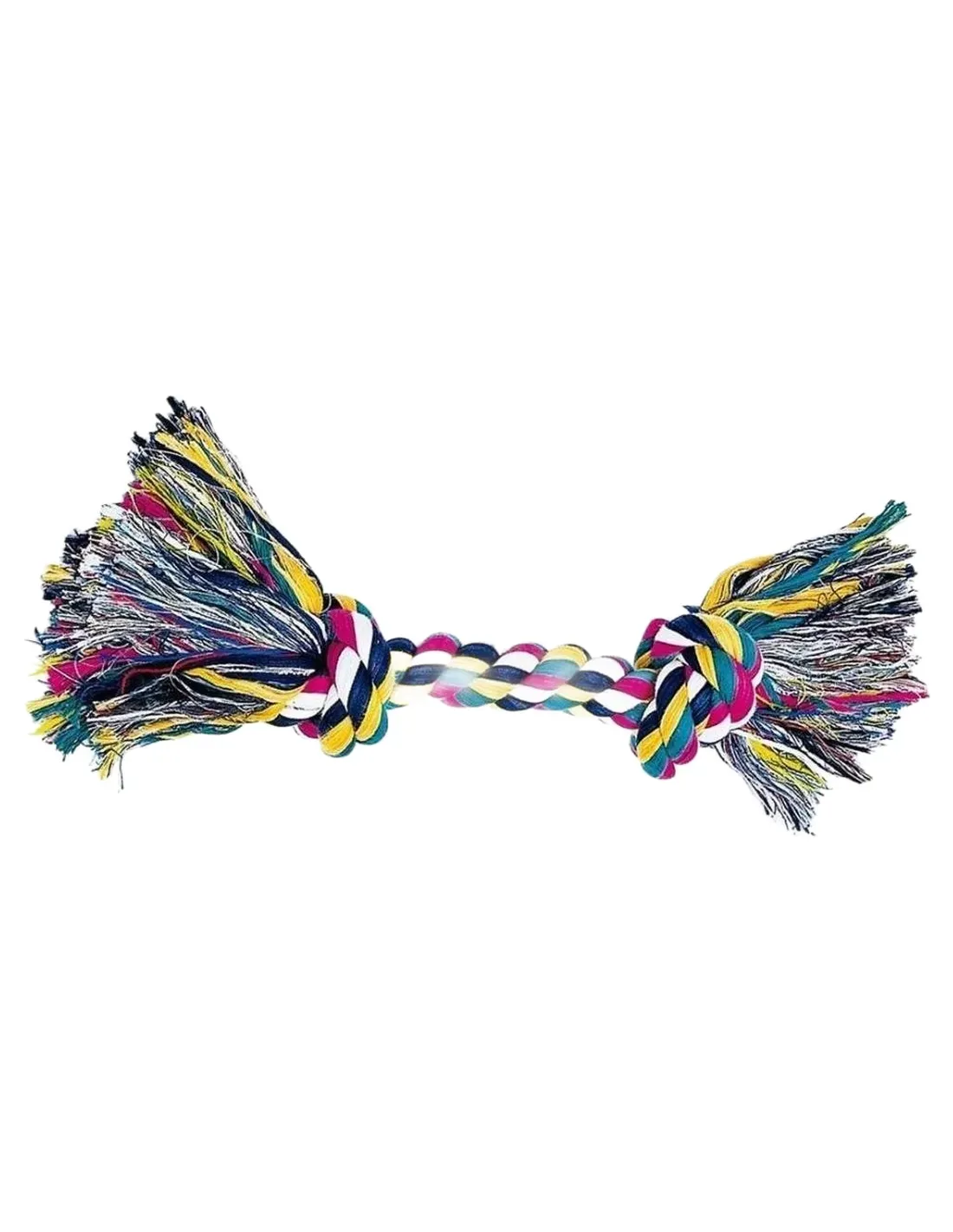 Les nœuds placés aux deux extrémités sont soigneusement réalisés pour assurer une prise optimale par le chien lors de la mastication, évitant ainsi que le produit ne s'effondre et conservant une consistance solide mais confortable. La texture du coton est conçue pour stimuler la salive, qui agit comme un antibactérien naturel à l'intérieur de la bouche du chien, aidant à réduire la formation de plaque dentaire et à maintenir l'hygiène buccale.