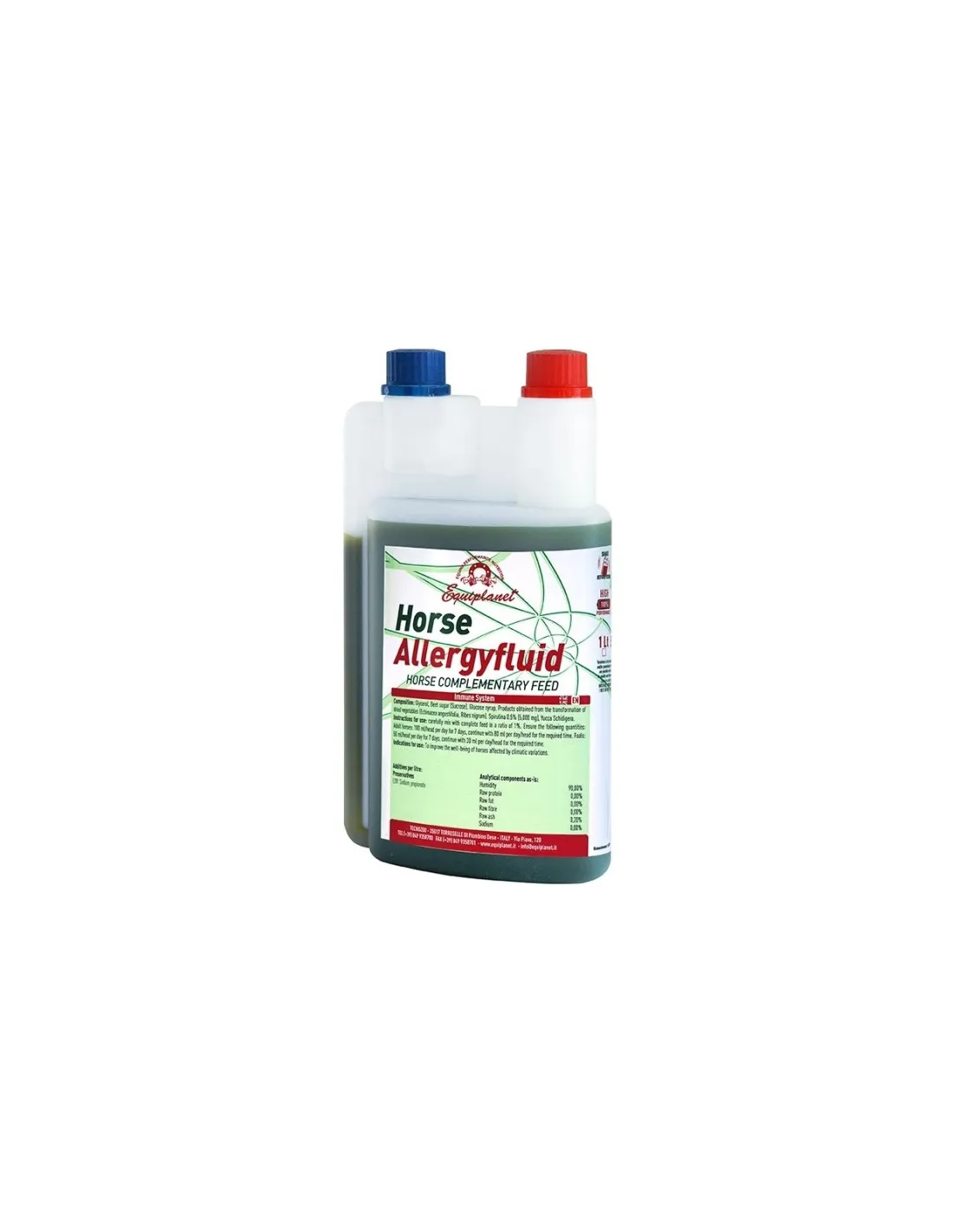 La composition de Horse Allergyfluid est basée sur un ensemble d’ingrédients actifs et d’agents de soutien naturels soigneusement sélectionnés. Le principal actif apaisant agit en réduisant l’inflammation cutanée et en favorisant la régénération des tissus. Sont également inclus des extraits de plantes aux propriétés antioxydantes et immunomodulatrices reconnues, qui contribuent à renforcer les défenses naturelles de l'organisme et à limiter les réponses excessives aux stimuli allergènes. Tous les composants sont présents dans des concentrations calibrées pour offrir une efficacité et une sécurité maximales lors de traitements prolongés.