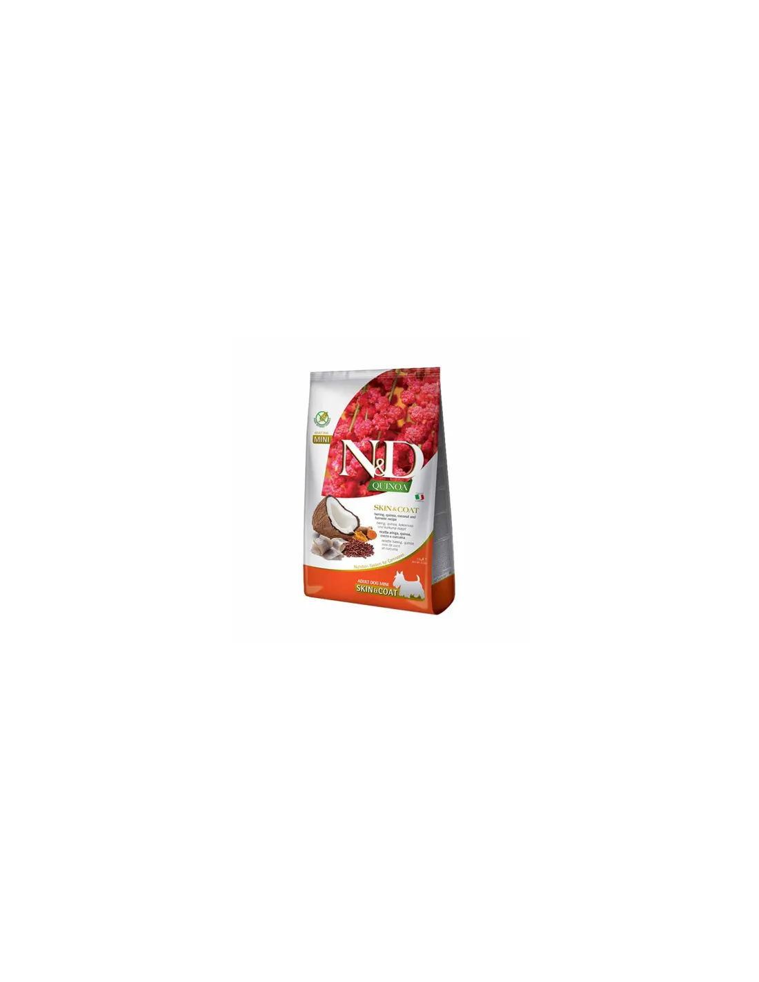 N&D Quinoa Skin&Coat est formulé pour les chiens adultes présentant des sensibilités alimentaires, aidant à maintenir le bien-être de la peau et du pelage grâce à des nutriments essentiels tels que l'huile de hareng, riche en oméga-3, et la noix de coco.