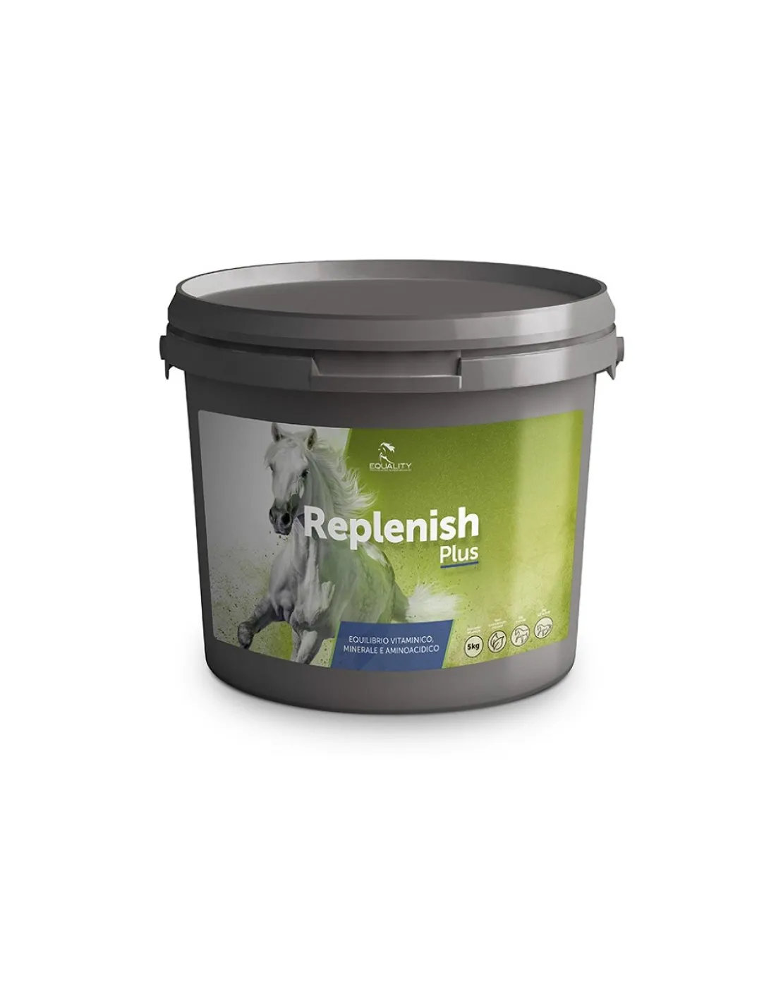 Replenish Plus est disponible dans un seau pratique de 5 kg, qui garantit une gestion et une conservation faciles du produit. Il s'agit d'un aliment complémentaire et d'un complément qui s'intègre parfaitement dans l'alimentation quotidienne des chevaux, contribuant à maintenir un équilibre nutritionnel optimal pour soutenir leurs activités quotidiennes et sportives.
