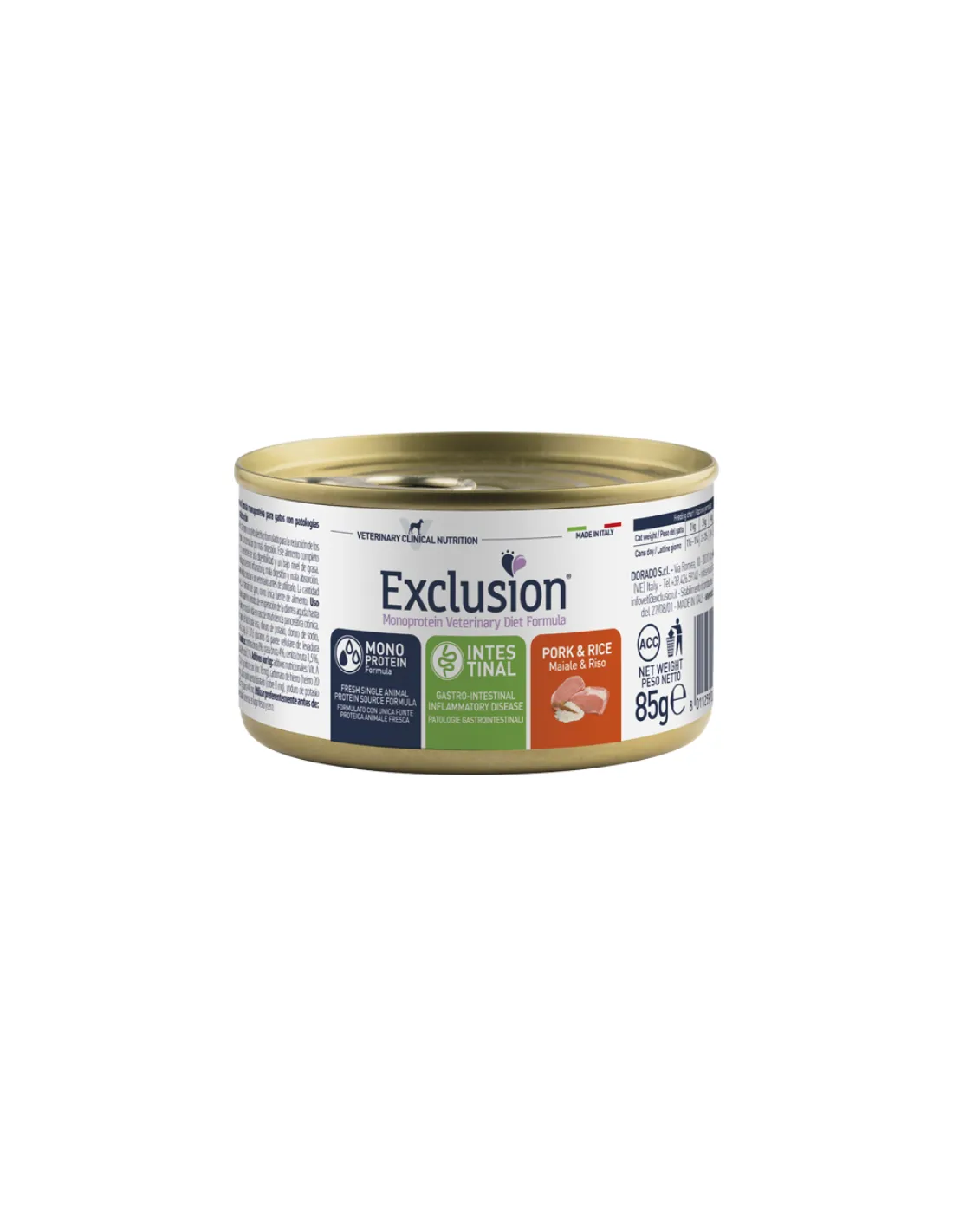 Exclusion Diet Cat Intestinal Porc et Riz 85 gr est un aliment diététique complet pour chat, formulé pour favoriser la santé intestinale et compenser une mauvaise digestion. Ce produit est idéal pour réduire les troubles aigus de l'absorption intestinale, en offrant un repas nutritif et équilibré.