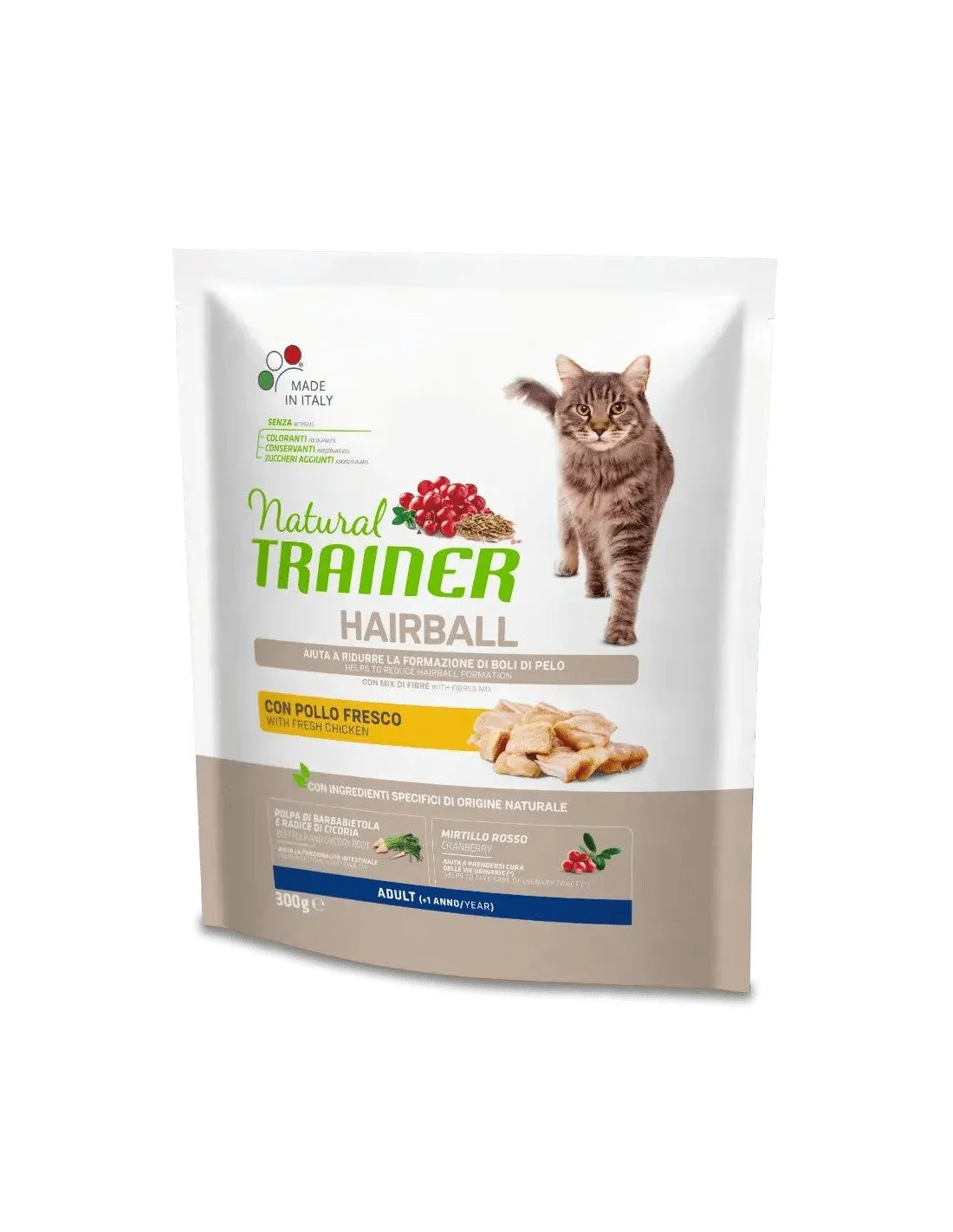 La composition des croquettes Natural Trainer Hairball a été soigneusement équilibrée pour offrir une nutrition complète et de haute qualité. Le poulet frais est la principale source de protéines, choisie pour sa digestibilité et son goût apprécié des chats. Le mélange de fibres, composé de fibres de pois, de graines de lin, d'extrait de chicorée et de fibres d'avoine, est essentiel pour favoriser la motilité intestinale et l'excrétion des cheveux ingérés. Les FOS, prébiotiques naturels, associés à la pulpe de betterave rouge, soutiennent le microbiote intestinal et améliorent la santé digestive. Les acides gras oméga-3 et oméga-6, ainsi que la biotine, sont essentiels pour garder la peau hydratée et le pelage brillant et fort. Ces ingrédients ont été sélectionnés non seulement pour leurs bienfaits nutritionnels, mais également pour leur impact positif sur l'environnement, étant biologiques et/ou biodégradables. La formule est sans colorants artificiels ni conservateurs, garantissant un produit naturel et sûr pour votre chat.