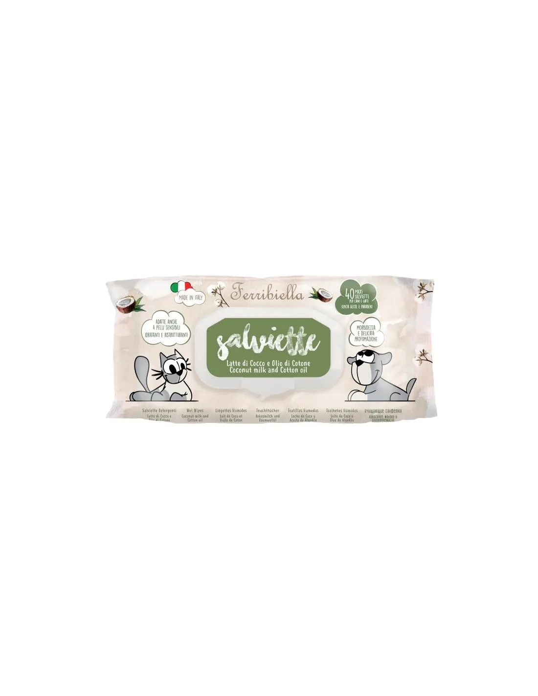 Les lingettes nettoyantes Ferribiella au lait de coco et à l'huile de coton sont idéales pour le nettoyage quotidien des chiens et des chats. Chaque paquet contient 40 morceaux de lingettes douces et parfumées, parfaites pour garder votre animal propre et frais.