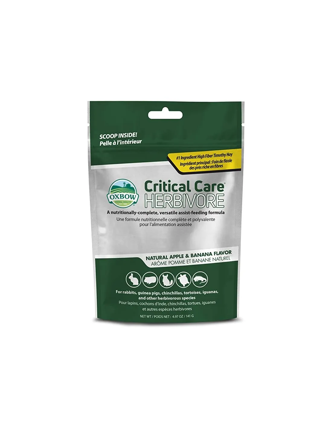 Herbivore Critical Care Apple and Banana a été le premier produit du genre et continue d'être la norme en matière de soins d'urgence pour les petits herbivores. Il est particulièrement adapté lorsque le manque d'appétit de l'animal est dû à une maladie, une convalescence postopératoire ou des douleurs, jouant un rôle nutritionnel important dans le cadre du programme de convalescence du « patient ». La perte d'appétit est souvent un symptôme secondaire d'une pathologie, c'est pourquoi l'utilisation de ce produit doit avoir lieu sous la surveillance d'un vétérinaire.