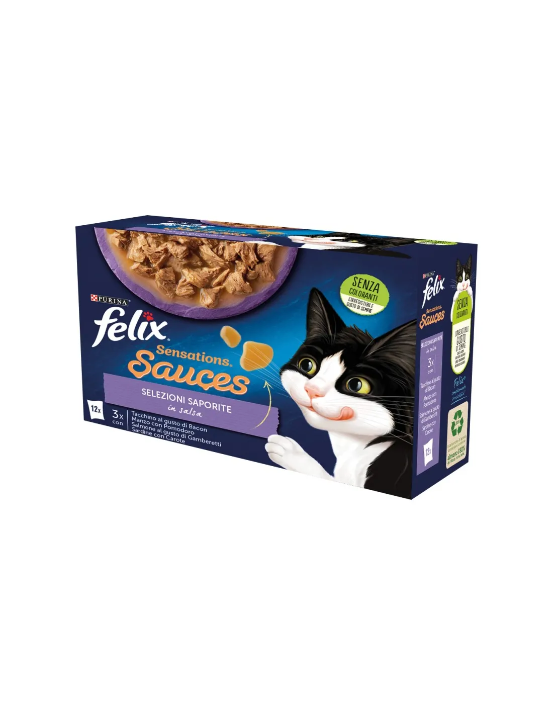 Purina Felix sélections savoureuses en sauce sauces sensations est une nourriture humide pour chat, présentée en paquet de 12 sachets de 85 g chacun. Ce produit offre une variété de saveurs délicieuses que votre chat adorera. Chaque sachet est rempli de morceaux tendres et succulents dans une délicieuse sauce.