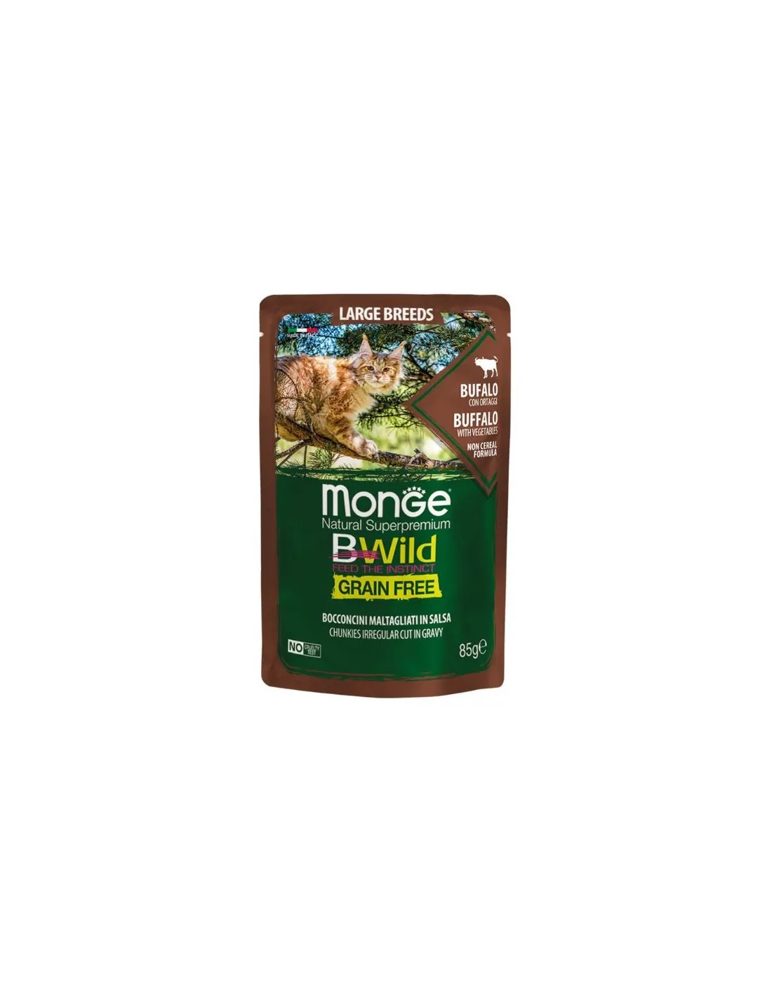Monge Natural Super Premium Bwild Grain Free Formula Buffalo aux légumes est un aliment complet et équilibré pour chatons et chats adultes de grande race. Ce produit est idéal pour maintenir une alimentation saine et naturelle, sans céréales, avec des ingrédients de haute qualité comme le buffle et une sélection de légumes frais comme les haricots verts et les carottes.
