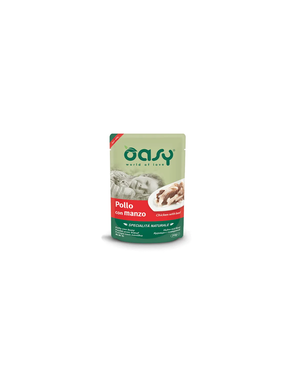 Oasy Cat Natural Specialties Poulet au Bœuf est une nourriture humide de haute qualité pour chats, présentée dans des sachets pratiques de 70 g. Ce produit associe du poulet et du bœuf pour offrir un repas savoureux et nutritif, idéal pour répondre aux besoins alimentaires de votre chat.