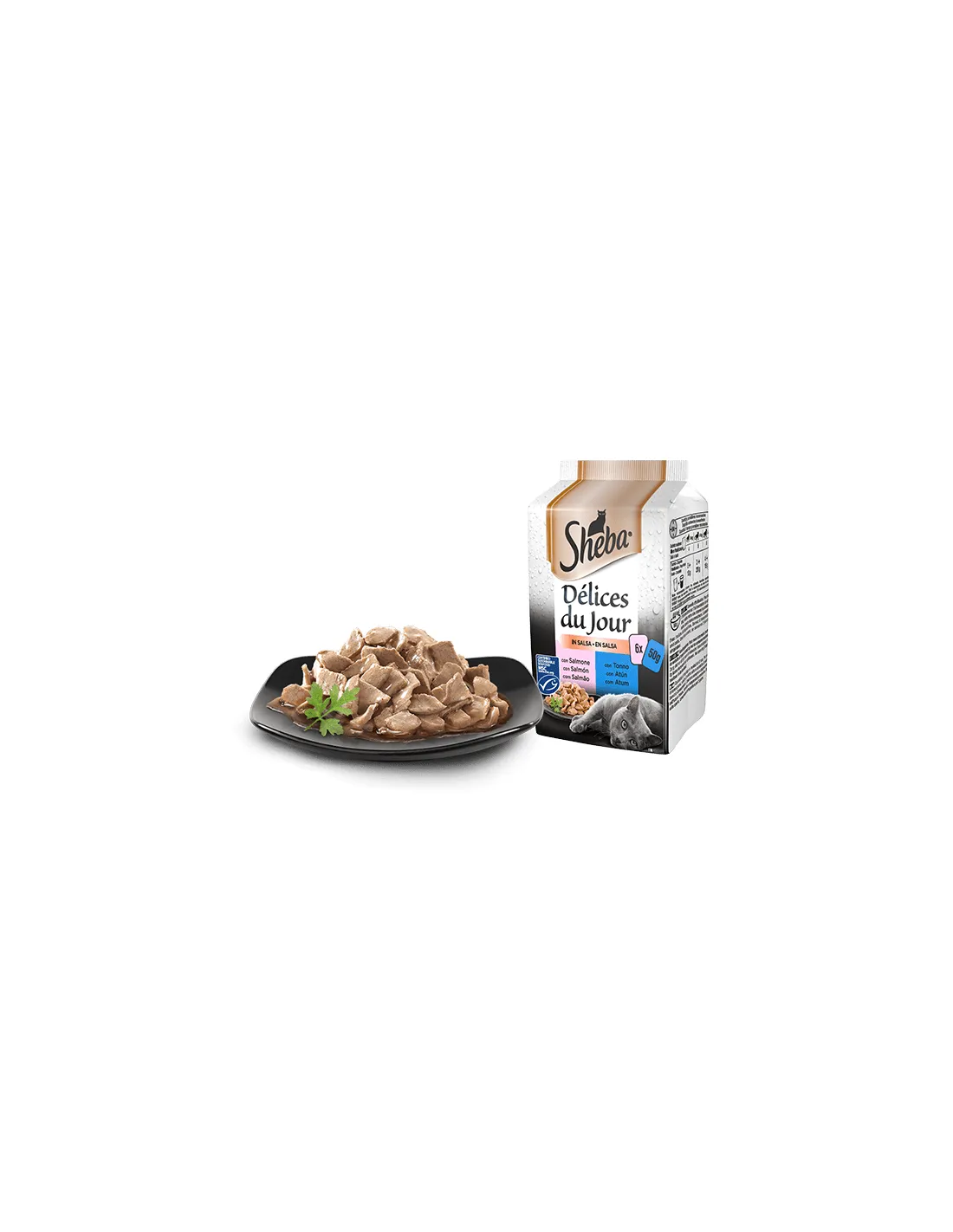 Sheba Délices du Jour est formulée pour les chats adultes et convient à toutes les races. Cet aliment contribue à une alimentation équilibrée, en apportant des protéines de haute qualité essentielles au maintien de la masse musculaire. Le poulet et le saumon sont d'excellentes sources d'acides aminés, tandis que la sauce ajoute un élément hydratant important au repas.