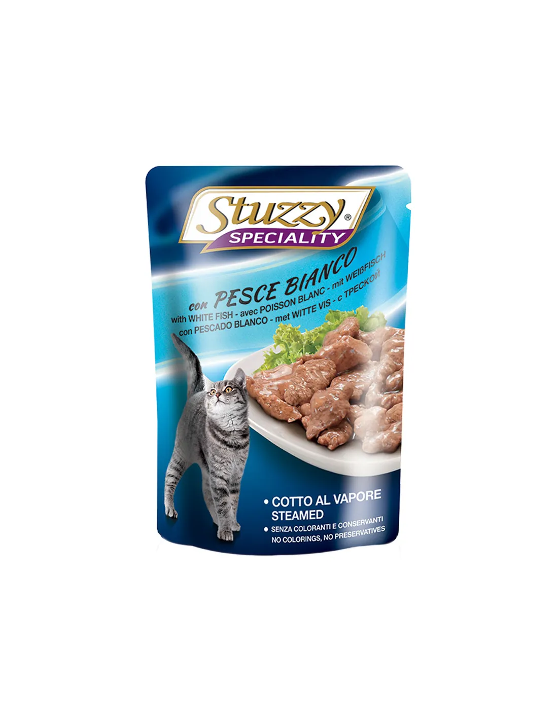 Les Sfilaccetti au poisson blanc de Stuzzy offrent à votre chat une recette complète et authentique, préparée avec du poisson de haute qualité et des ingrédients naturels. La cuisson lente rehausse les saveurs, rendant chaque bouchée irrésistible pour votre félin.
