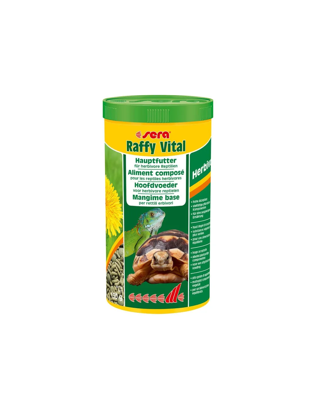 Le "Sera Raffy Vital Herbal Blend for Herbivorous Reptiles 1000 ml" est un mélange d'herbes spécialement formulé pour répondre aux besoins nutritionnels des reptiles herbivores. Conditionné dans un contenant de 1000 ml, il offre une solution alimentaire complète et équilibrée, idéale pour entretenir la santé et le bien-être des reptiles. Le produit décrit dans le contenu est la "Nourriture pour reptiles herbivores sera Reptil Raffy Vital 1 L". C'est un aliment spécifique pour les tortues terrestres et autres reptiles herbivores. Ce produit est formulé pour favoriser une croissance saine des os et de la coquille et est riche en fibres et en vitamines.