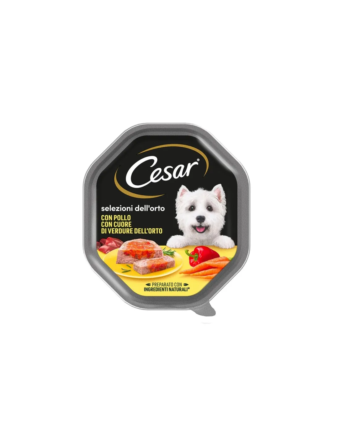 Le produit est "César® Sélections du jardin au poulet au coeur de légumes du jardin 0,150g". Il s'agit d'un pâté de poulet léger fourré d'un centre végétal moelleux. La ligne Cesar® Cuore di Verdure accompagne les meilleures viandes avec des légumes cuits séparément, pour garder intact tout le meilleur qu'offre la nature. Les ingrédients comprennent de la viande et ses dérivés (51%, 95% naturels ; dont foie de poulet 4%), des légumes (dont un mélange de carottes et de poivrons rouges séchés 0,6%, équivalent à un mélange de carottes et de poivrons rouges 4%), des minéraux, des céréales, des sous-produits d'origine végétale.