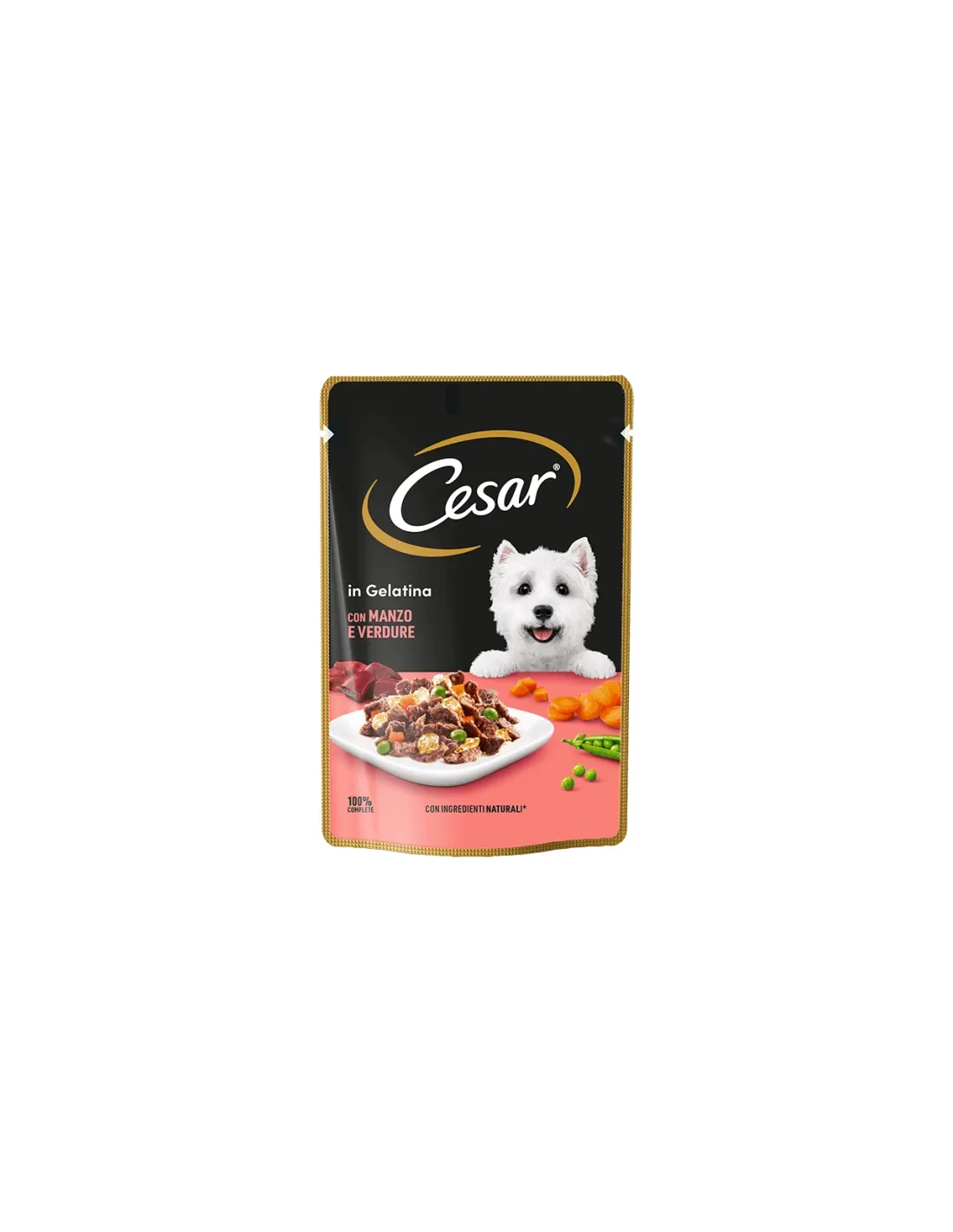 Conditionné dans un emballage pratique de 100 grammes, Cesar Delizie del Giorno est facile à servir et offre un repas complet et équilibré à votre chien. Le bœuf de haute qualité et les légumes frais en gelée constituent une source de protéines et de vitamines essentielles à la santé de votre chien.