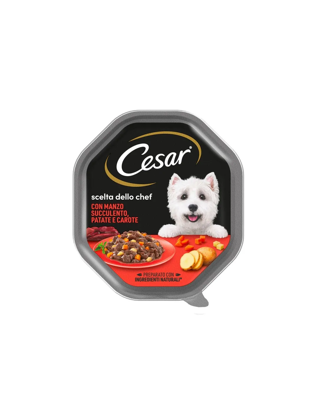 Cesar Dog Chef's Choice Au Bœuf, Pommes de Terre et Carottes est un aliment humide complet et équilibré pour chien adulte, conditionné dans une barquette pratique en portion individuelle de 150 g. Ce produit est disponible sur L'Isola dei Tesori.