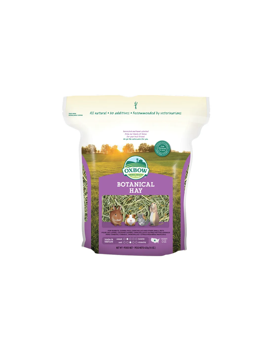 Oxbow Botanical Hay est fabriqué à partir de Western Timothy Hay et d'un assortiment de trois des herbes suivantes : camomille, mélisse, verveine, hibiscus, lavande, églantier, consoude, bourrache ou fleurs de trèfle rouge. La sélection d'herbes peut varier en fonction de la période de récolte.