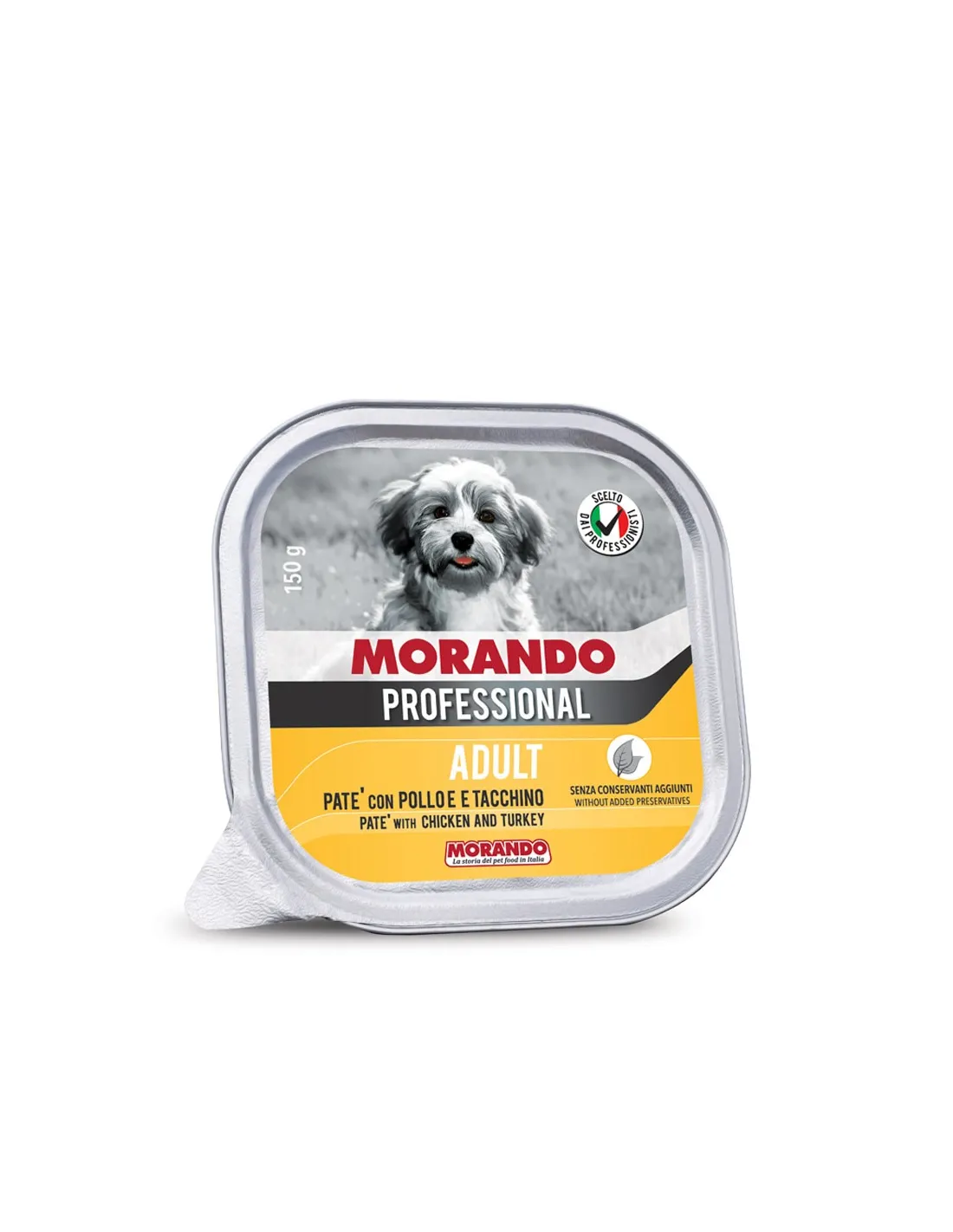 Morando Miglior Cane Professional Adult Pâté au Poulet et à la Dinde est un aliment humide de haute qualité pour chiens adultes, présenté dans des barquettes pratiques de 150 g. Ce produit fait partie de la gamme Professional de Morando, connue pour son engagement à fournir des aliments équilibrés et savoureux aux animaux de compagnie. Chaque barquette contient un riche pâté préparé avec du poulet et de la dinde, des ingrédients choisis pour garantir un apport protéique optimal et satisfaire même les palais les plus exigeants.