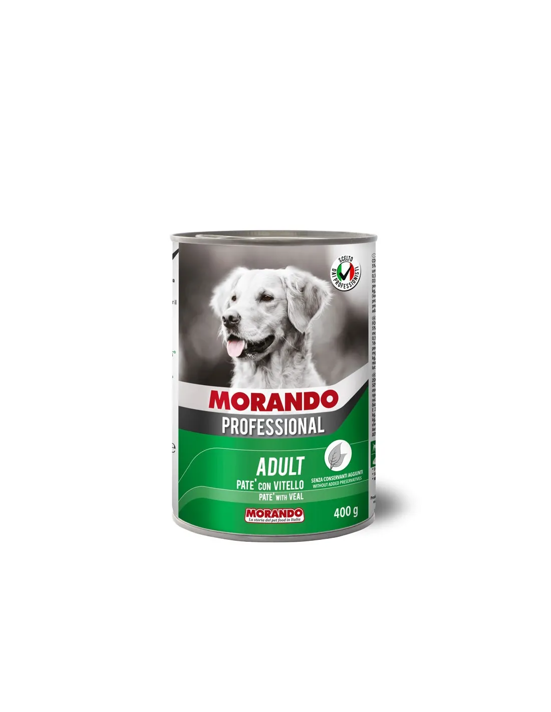 Morando Professional ADULTE PATÈ AU VEAU est un aliment complet et équilibré pour chien adulte, présenté dans une boîte pratique de 400 g. Ce pâté a été formulé pour répondre aux besoins nutritionnels des chiens adultes, garantissant une haute digestibilité et une excellente appétence. La recette contient 50 % de viande et dérivés, dont 5 % de veau, ce qui la rend non seulement nutritive mais aussi très savoureuse.