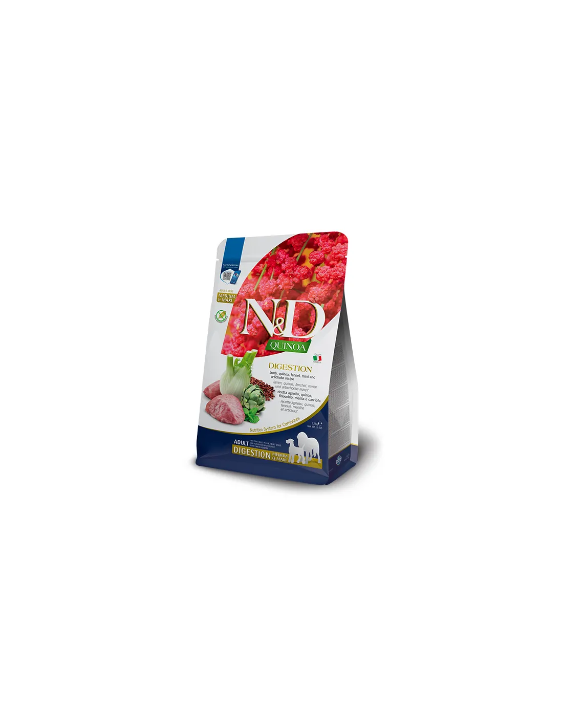 ND Quinoa Canine Digestion Canard et Myrtille 7KG est indiqué chez les chiens présentant des symptômes attribuables à des troubles digestifs, tels que des diarrhées récurrentes, des selles molles, des météorismes ou un gonflement abdominal. Il est recommandé en cas d'intolérances ou de sensibilités alimentaires, grâce au choix de la viande de canard comme seule source de protéines d'origine animale et à l'absence d'ingrédients potentiellement allergisants. La myrtille, avec sa haute teneur en phytonutriments et antioxydants, a une action protectrice contre les dommages oxydatifs et soutient le système immunitaire, tandis que le quinoa agit comme une source d'énergie facilement assimilable et respecte la physiologie digestive du chien.